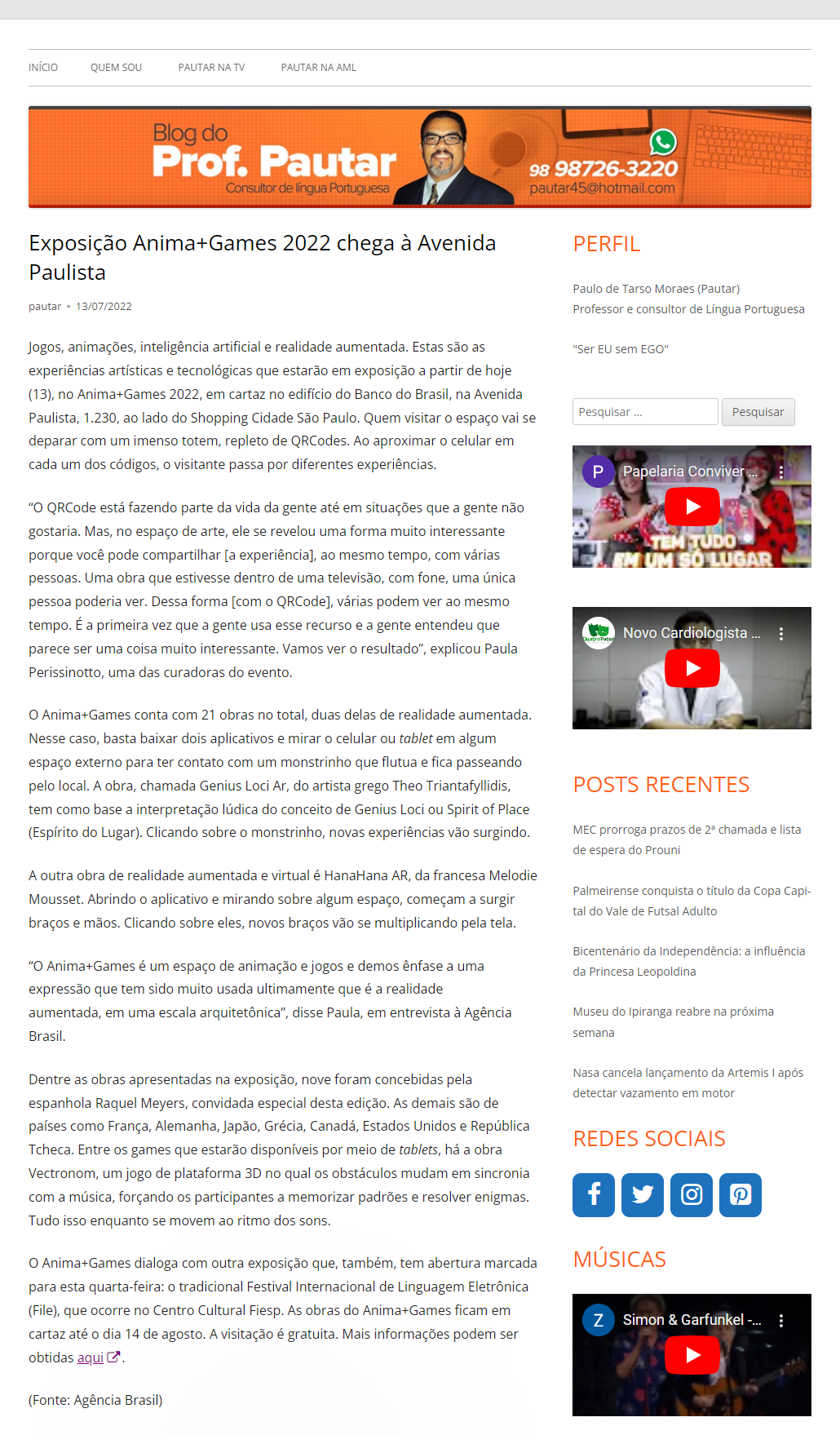 ANIMA+GAMES 2022 – Brasília Total NomeANIMA+GAMES 2022 - Brasília TotalAno (s) / Edição (ões)2022EventoANIMA+GAMES 2022DescriçãoBrasília Total - Online Exposição Anima+Games 2022 chega à Avenida Paulista 13 de julho de 2022 ANIMA+GAMES 2022 ANIMA+GAMES 2022 - Brasília Total animagames-2022-chega-avenida-paulista-blog-do-pautar_-blogdopautar.com_.br_ Link ClippingBrasília TotalDivulgaçãoClipping | Clipping > Jornal | Imprensa > Jornal > Online Evento: ["94904"]Educacional: []Obra Artística: []Participantes: [] Veja também: ANIMA+GAMES 2022 ANIMA+GAMES 2022 – NowGaming Voltar para a lista Anterior Próximo