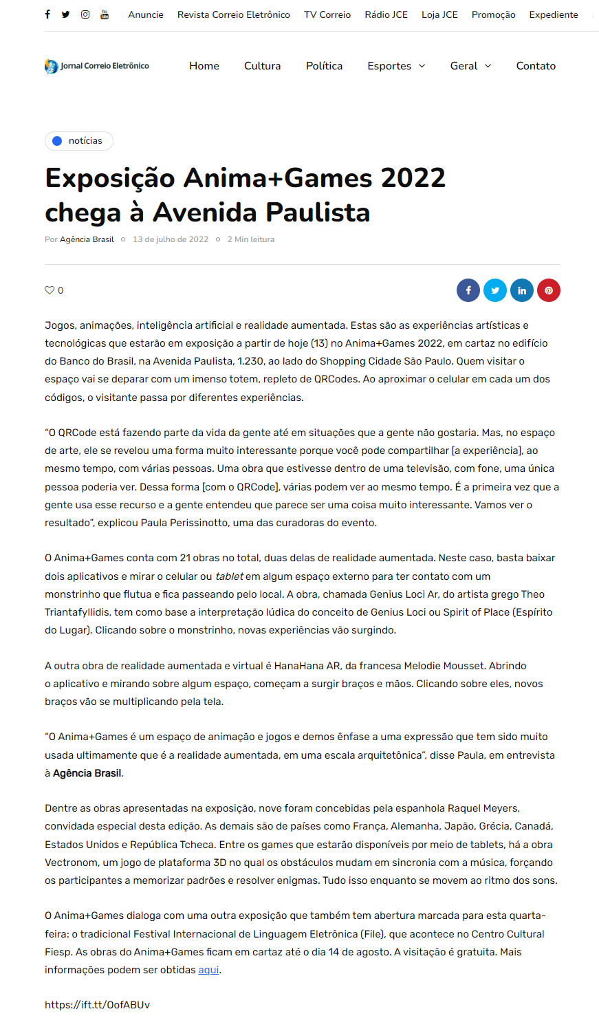 ANIMA+GAMES 2022 – Jornal Correio Eletrônico NomeANIMA+GAMES 2022 - Jornal Correio EletrônicoAno (s) / Edição (ões)2022EventoANIMA+GAMES 2022DescriçãoJornal Correio Eletrônico - Online Exposição Anima+Games 2022 chega à Avenida Paulista 13/07/2022 ANIMA+GAMES 2022 ANIMA+GAMES 2022- JORNAL CORREIO ELETRÔNICO animagames-2022-chega-avenida-paulista-jornal-correio-_-jornalcorreioeletronico.com_.br_ Link ClippingJornal Correio EletrônicoDivulgaçãoClipping | Clipping > Jornal | Imprensa > Jornal > Online Evento: ["94904"]Educacional: []Obra Artística: []Participantes: [] Veja também: ANIMA+GAMES 2022 ANIMA+GAMES 2022 – NowGaming Voltar para a lista Anterior Próximo