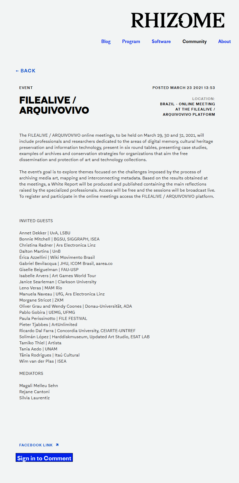 FILEALIVE / ARQUIVOVIVO – 2021 | RHIZOME NomeFILEALIVE / ARQUIVOVIVO – 2021 | RHIZOMEAno (s) / Edição (ões)2021EventoFILE ALIVE / ARQUIVOVIVODescriçãoEVENT FILEALIVE / ARQUIVOVIVO RHIZOME MARCH 23 2021 FILEALIVE / ARQUIVOVIVO – 2021 RHIZOME: EVENT FILEALIVE / ARQUIVOVIVO - MARCH 23 2021 rhizome_filealive_arquivovivo_2021 Link ClippingRHIZOMEDivulgaçãoClipping | Imprensa > Revista > Online | Clipping > Revista Evento: ["26462"]Educacional: []Obra Artística: []Participantes: [] Veja também: FILE ALIVE / ARQUIVOVIVO FILEALIVE / ARQUIVOVIVO – 2021 | SISEM-SP Voltar para a lista Anterior Próximo