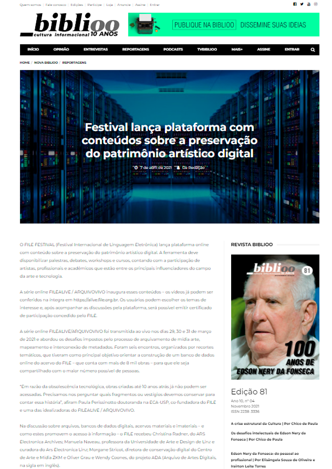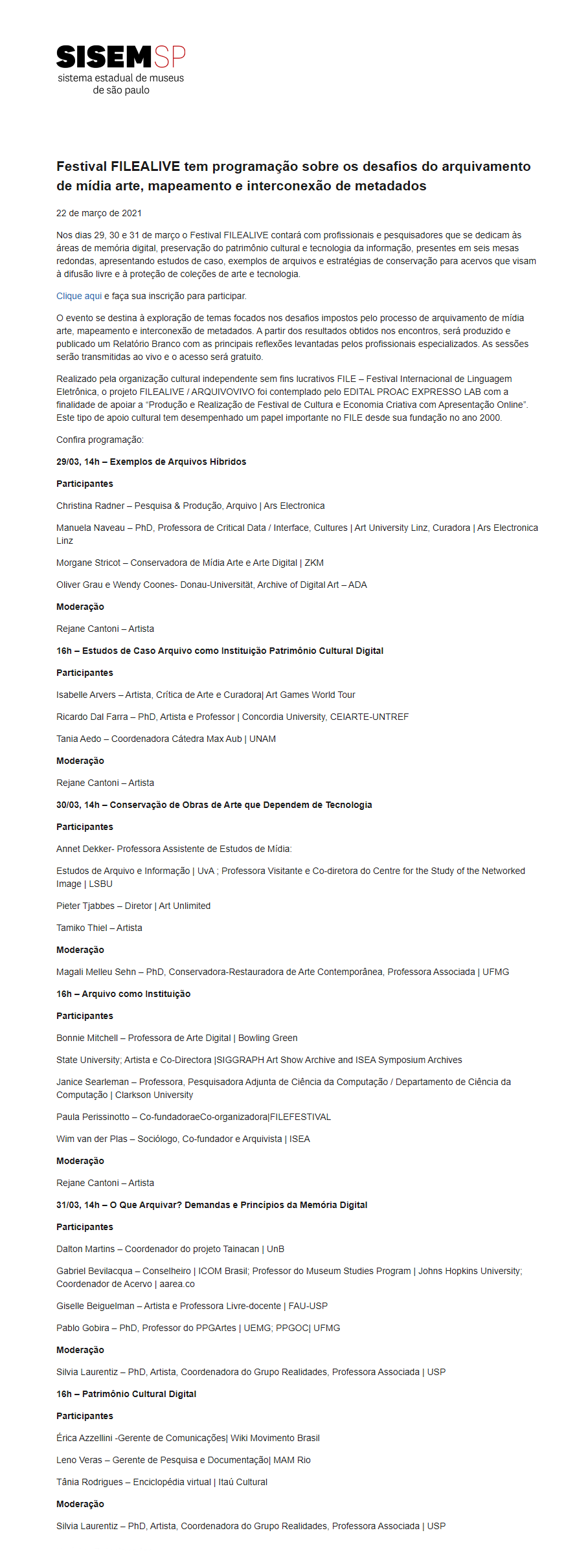 SISEM-SP: Festival FILEALIVE tem Programação sobre os desafios do arquivamento de mídia arte, mapeamento e interconexão de metadados - 22 de março de 2021