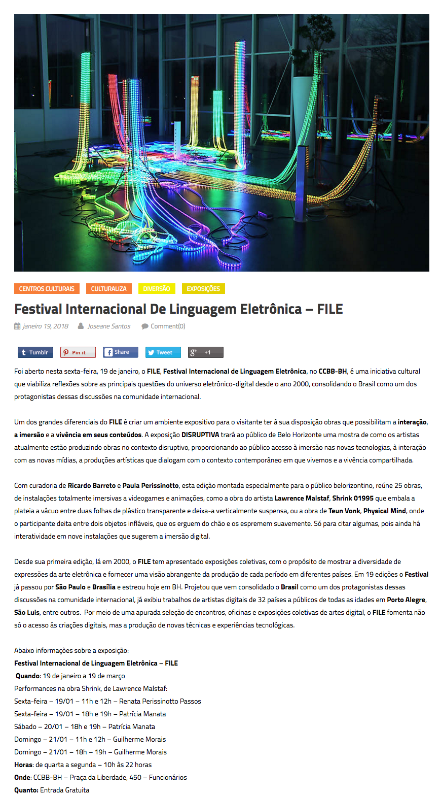 FILE BELO HORIZONTE 2018 – Culturaliza BH NomeFILE BELO HORIZONTE 2018 - Culturaliza BHAno (s) / Edição (ões)2018EventoFILE BELO HORIZONTE 2018DescriçãoFILE BELO HORIZONTE 2018 Culturaliza BH Joseane Santos - 19 jan, 2018 file-belo-horizonte-clipping-culturaliza-bh DivulgaçãoClipping > Blog | Clipping Evento: ["26973"]Educacional: []Obra Artística: []Participantes: [] Veja também: FILE BELO HORIZONTE 2018 FILE BELO HORIZONTE 2018 – Sou BH Noticias Voltar para a lista Anterior Próximo