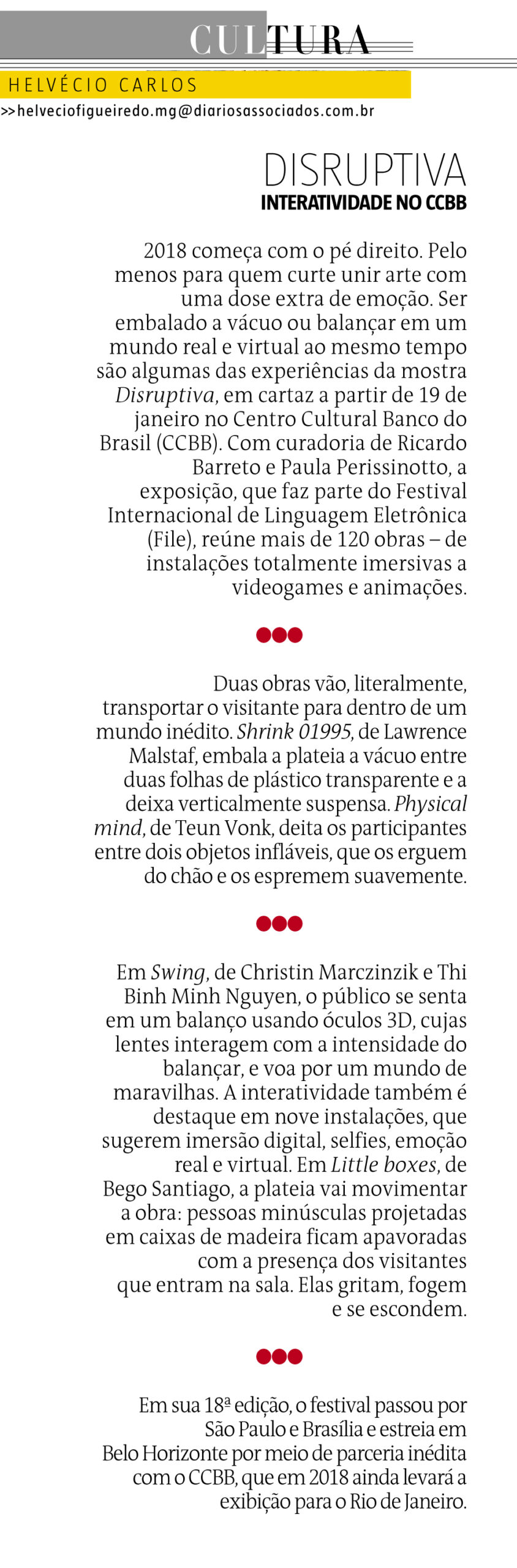FILE BELO HORIZONTE 2018 – Estado de Minas Gerais NomeFILE BELO HORIZONTE 2018 - Estado de Minas GeraisAno (s) / Edição (ões)2018EventoFILE BELO HORIZONTE 2018DescriçãoFILE BELO HORIZONTE 2018 Estado de Minas Gerais file-belo-horizonte-clipping-estado-de-minas-gerais DivulgaçãoImprensa | Imprensa > Jornal Evento: ["26973"]Educacional: []Obra Artística: []Participantes: [] Veja também: FILE BELO HORIZONTE 2018 FILE BELO HORIZONTE 2018 – Sou BH Noticias Voltar para a lista Anterior Próximo