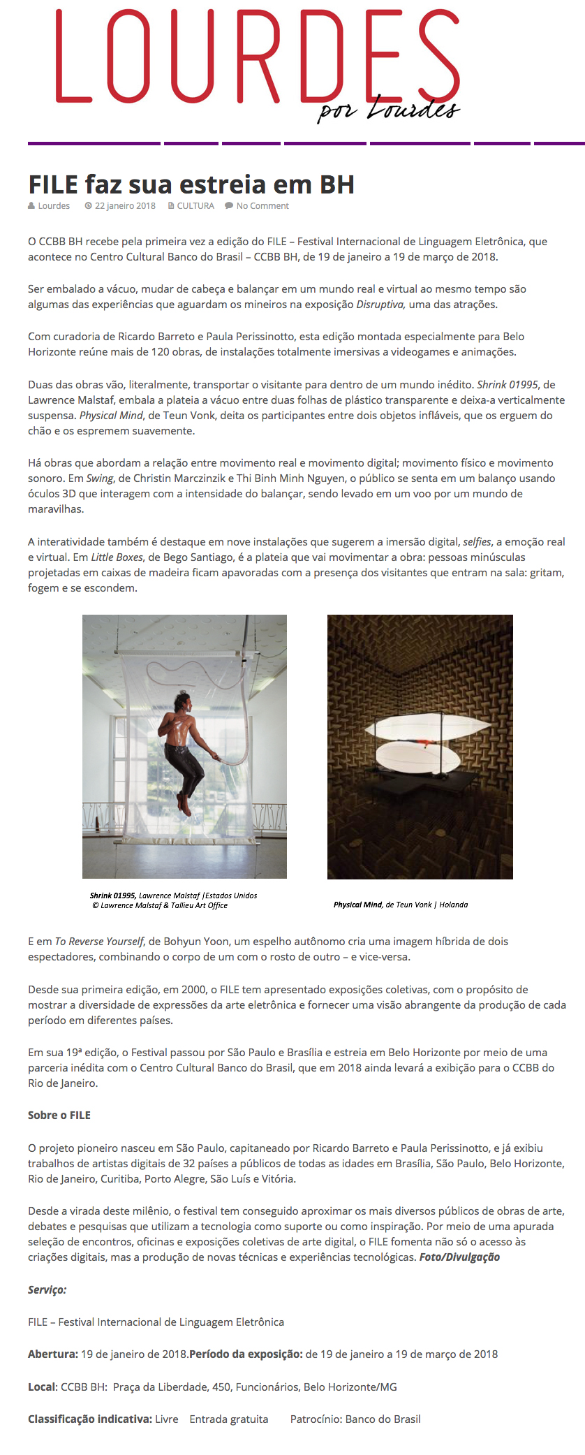 FILE BELO HORIZONTE 2018 – Lourdes NomeFILE BELO HORIZONTE 2018 - LourdesAno (s) / Edição (ões)2018EventoFILE BELO HORIZONTE 2018DescriçãoFILE BELO HORIZONTE 2018 Lourdes Lourdes - 22 jan, 2018 file-belo-horizonte-clipping-lourdes DivulgaçãoClipping > Blog | Clipping Evento: ["26973"]Educacional: []Obra Artística: []Participantes: [] Veja também: FILE BELO HORIZONTE 2018 FILE BELO HORIZONTE 2018 – Sou BH Noticias Voltar para a lista Anterior Próximo