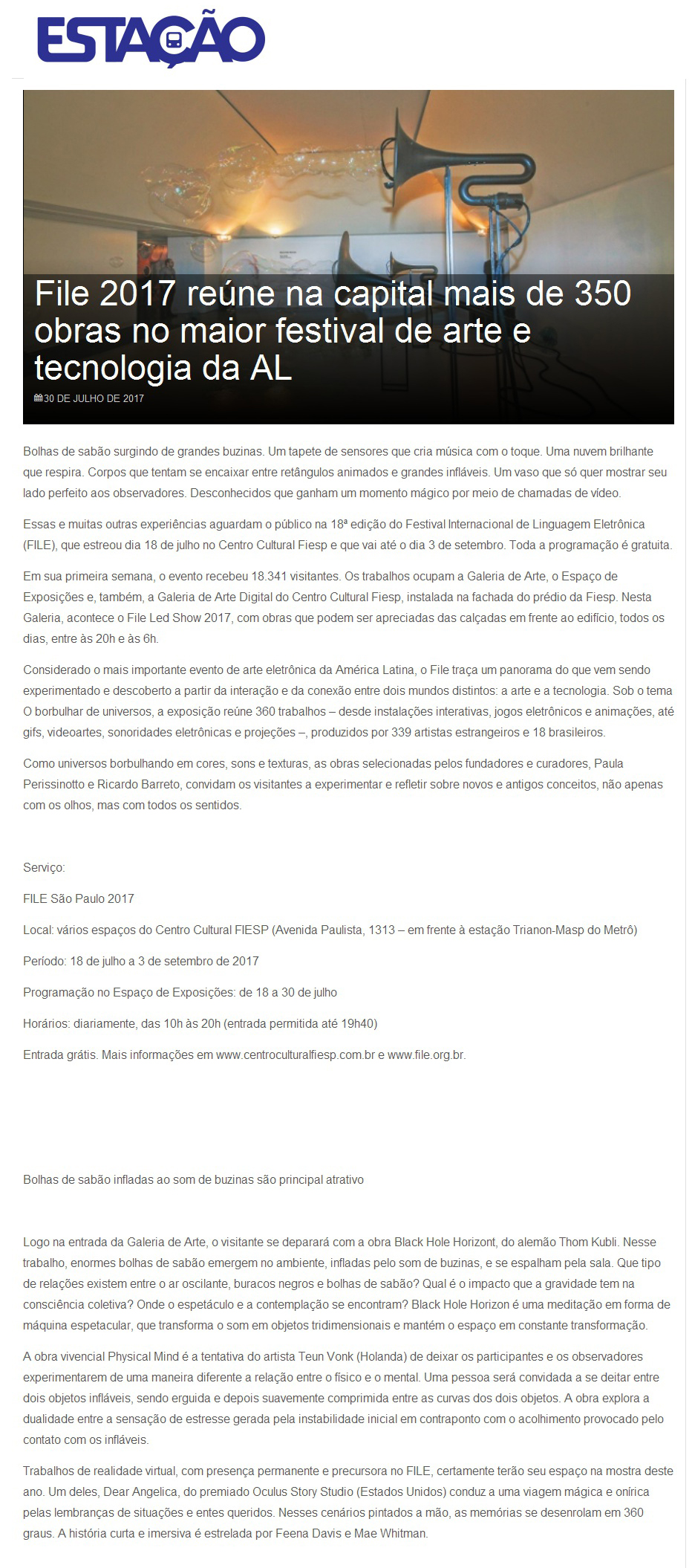 FILE SÃO PAULO 2017 – Jornal Estação NomeFILE SÃO PAULO 2017 - Jornal EstaçãoAno (s) / Edição (ões)2017EventoFILE SÃO PAULO 2017DescriçãoFILE SÃO PAULO 2017 Jornal Estação 30 jul, 2017 file-sao-paulo-2017-clipping-estacao DivulgaçãoImprensa | Imprensa > Jornal Evento: ["63520"]Educacional: []Obra Artística: []Participantes: [] Veja também: FILE SÃO PAULO 2017 FILE SÃO PAULO 2017 – Convite Postal Voltar para a lista Anterior Próximo