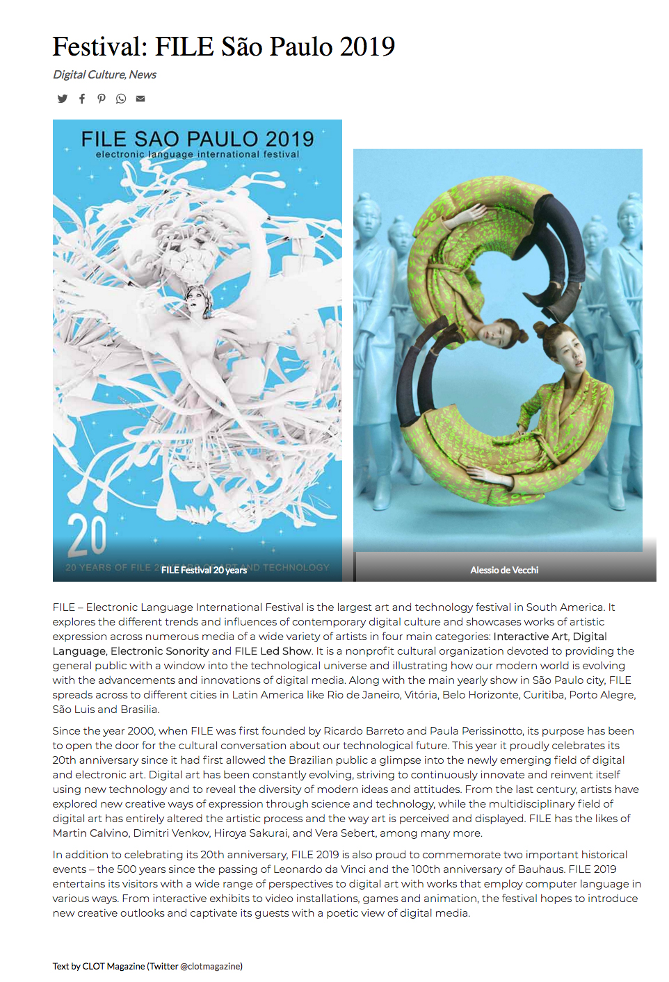 FILE SÃO PAULO 2019 – Clot Magazine / EN NomeFILE SÃO PAULO 2019 - Clot Magazine / ENAno (s) / Edição (ões)2019EventoFILE SÃO PAULO 2019DescriçãoFILE SÃO PAULO 2019 Clot Magazine / EN file-sao-paulo-2019-clipping-clot-magazine-en DivulgaçãoImprensa | Imprensa > Revista > Online | Imprensa > Revista Evento: ["1885"]Educacional: []Obra Artística: []Participantes: [] Veja também: FILE SÃO PAULO 2019 FILE SÃO PAULO 2019 – Neural / EN Voltar para a lista Anterior Próximo