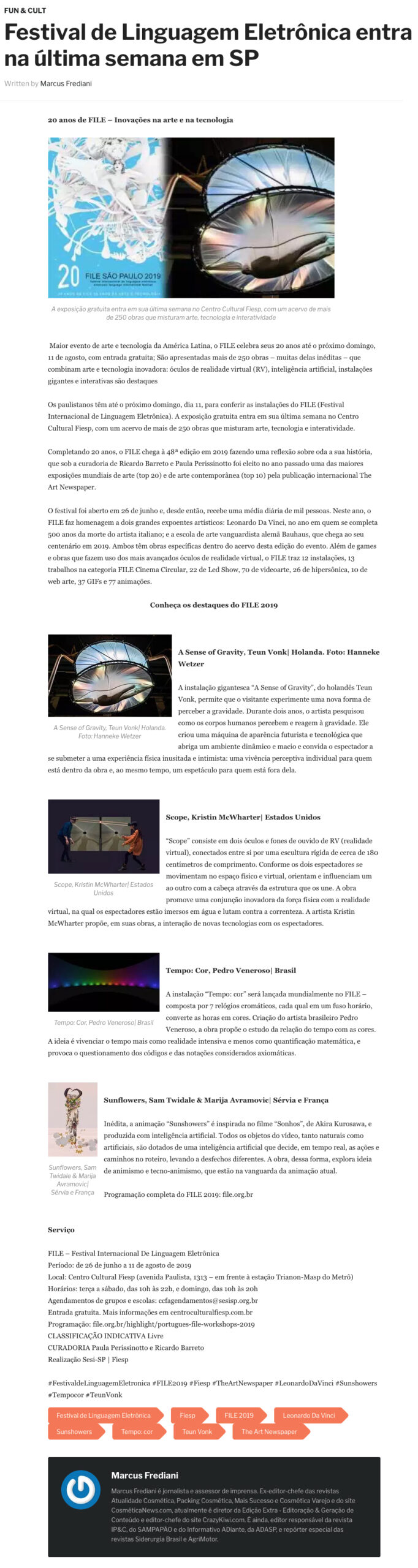 FILE SÃO PAULO 2019 – Crazykiwi NomeFILE SÃO PAULO 2019 - CrazykiwiAno (s) / Edição (ões)2019EventoFILE SÃO PAULO 2019DescriçãoFILE SÃO PAULO 2019 Crazykiwi Marcus Frediani file-sao-paulo-2019-clipping-crazykiwi DivulgaçãoImprensa | Imprensa > Online Evento: ["1885"]Educacional: []Obra Artística: []Participantes: [] Veja também: FILE SÃO PAULO 2019 FILE SÃO PAULO 2019 – Neural / EN Voltar para a lista Anterior Próximo