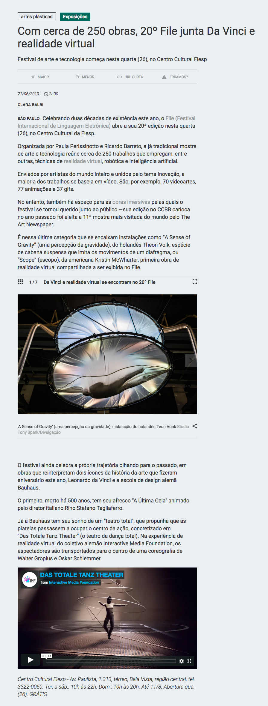 FILE SÃO PAULO 2019 – Guia Folha NomeFILE SÃO PAULO 2019 - Guia FolhaAno (s) / Edição (ões)2019EventoFILE SÃO PAULO 2019DescriçãoFILE SÃO PAULO 2019 Guia Folha Clara Balbi - 21 jun, 2019 file-sao-paulo-2019-clipping-guia-folha DivulgaçãoImprensa | Imprensa > Jornal | Imprensa > Jornal > Online Evento: ["1885"]Educacional: []Obra Artística: []Participantes: [] Veja também: FILE SÃO PAULO 2019 FILE SÃO PAULO 2019 – Neural / EN Voltar para a lista Anterior Próximo