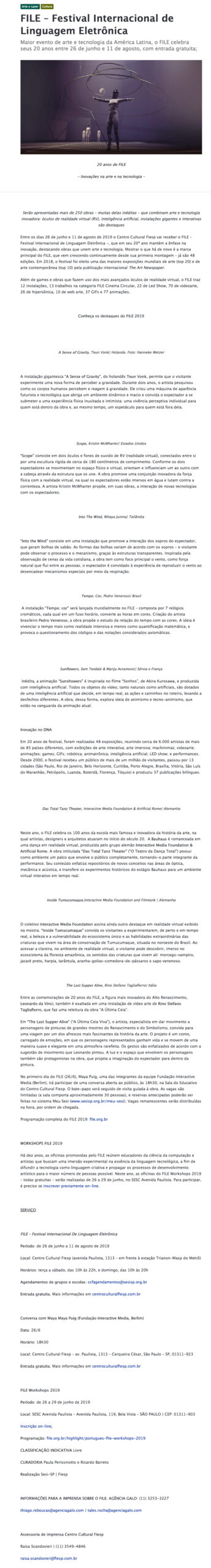 FILE SÃO PAULO 2019 – Inforex NomeFILE SÃO PAULO 2019 - InforexAno (s) / Edição (ões)2019DescriçãoFILE SÃO PAULO 2019 Inforex file-sao-paulo-2019-clipping-inforex DivulgaçãoImprensa | Imprensa > Online Evento: []Educacional: []Obra Artística: []Participantes: [] Voltar para a lista Anterior Próximo