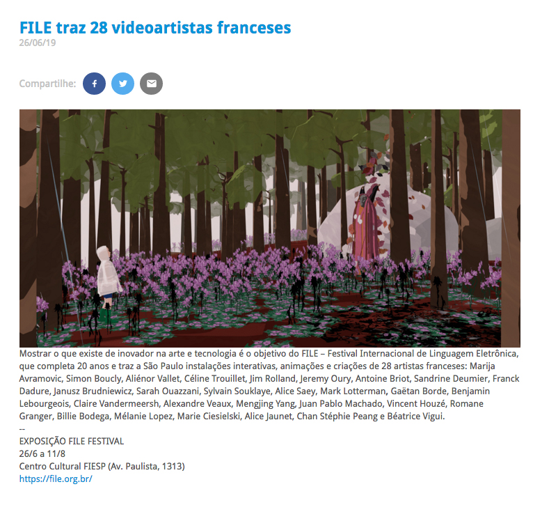 FILE SÃO PAULO 2019 – Instituto Francês do Brasil NomeFILE SÃO PAULO 2019 - Instituto Francês do BrasilAno (s) / Edição (ões)2019EventoFILE SÃO PAULO 2019DescriçãoFILE SÃO PAULO 2019 Instituto Francês do Brasil 26 jun, 2019 file-sao-paulo-2019-clipping-instituto-frances-do-br DivulgaçãoImprensa | Imprensa > Online Evento: ["1885"]Educacional: []Obra Artística: []Participantes: [] Veja também: FILE SÃO PAULO 2019 FILE SÃO PAULO 2019 – Neural / EN Voltar para a lista Anterior Próximo