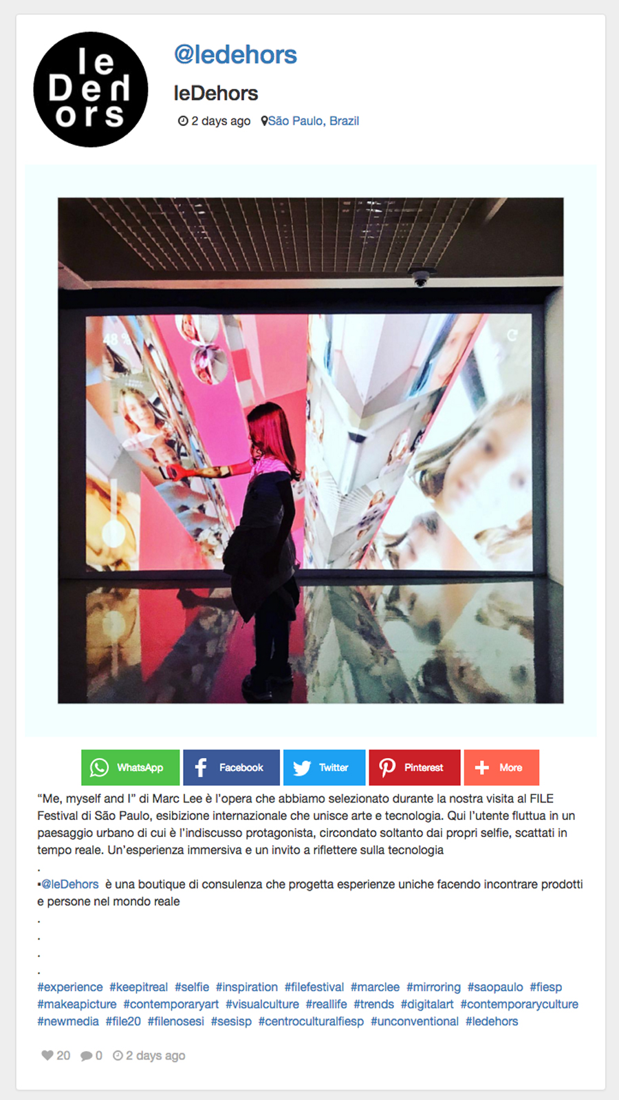 FILE SÃO PAULO 2019 – leDehors / IT NomeFILE SÃO PAULO 2019 - leDehors / ITAno (s) / Edição (ões)2019EventoFILE SÃO PAULO 2019DescriçãoFILE SÃO PAULO 2019 leDehors / IT file-sao-paulo-2019-clipping-ledehors-it DivulgaçãoImprensa | Imprensa > Online Evento: ["1885"]Educacional: []Obra Artística: []Participantes: [] Veja também: FILE SÃO PAULO 2019 FILE SÃO PAULO 2019 – Neural / EN Voltar para a lista Anterior Próximo