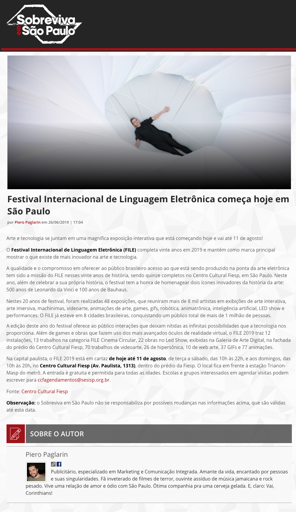 FILE SÃO PAULO 2019 – Sobreviva em São Paulo NomeFILE SÃO PAULO 2019 - Sobreviva em São PauloAno (s) / Edição (ões)2019EventoFILE SÃO PAULO 2019DescriçãoFILE SÃO PAULO 2019 Sobreviva em São Paulo Piero Paglarin - 26 jun, 2019 file-sao-paulo-2019-clipping-sobreviva-em-sao-paulo DivulgaçãoImprensa > Online > Blog | Imprensa | Imprensa > Online Evento: ["1885"]Educacional: []Obra Artística: []Participantes: [] Veja também: FILE SÃO PAULO 2019 FILE SÃO PAULO 2019 – Neural / EN Voltar para a lista Anterior Próximo