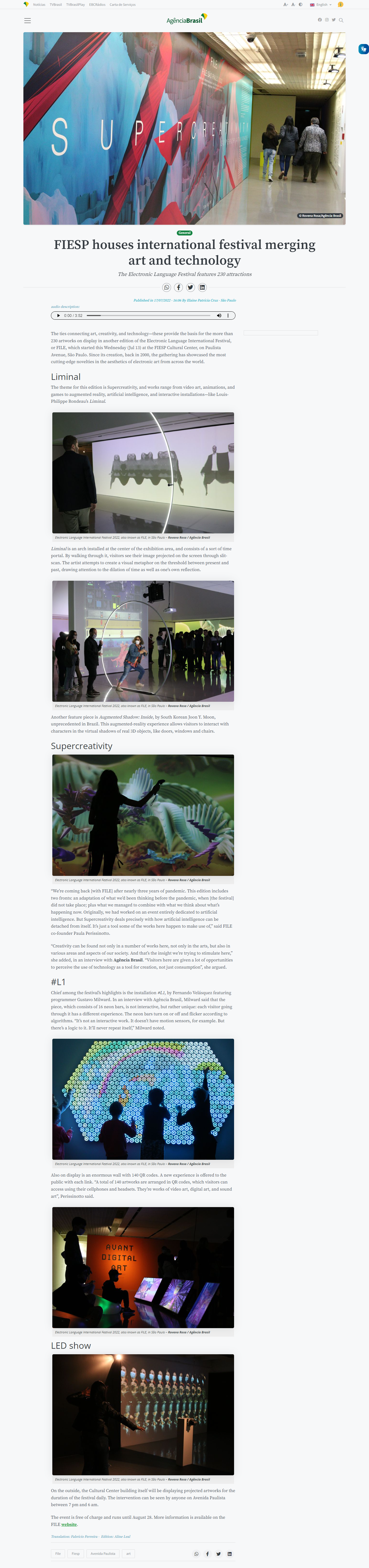 FILE SÃO PAULO 2022 – SUPERCRIATIVIDADE – Agência Brasil NomeFILE SÃO PAULO 2022 - SUPERCRIATIVIDADE - Agência BrasilAno (s) / Edição (ões)2022EventoFILE SÃO PAULO 2022DescriçãoFILE SÃO PAULO 2022 - SUPERCRIATIVIDADE Agência Brasil 13/07/2022 FILE SÃO PAULO 2022 - SUPERCRIATIVIDADE - Agência Brasil file-sao-paulo-2022-supercriatividade-agencia-brasil-imprensa Link ClippingAgência Brasil Evento: ["115675"]Educacional: []Obra Artística: []Participantes: [] Veja também: FILE SÃO PAULO 2022 FILE SÃO PAULO 2022 – SUPERCRIATIVIDADE – Paulista Flat Voltar para a lista Anterior Próximo