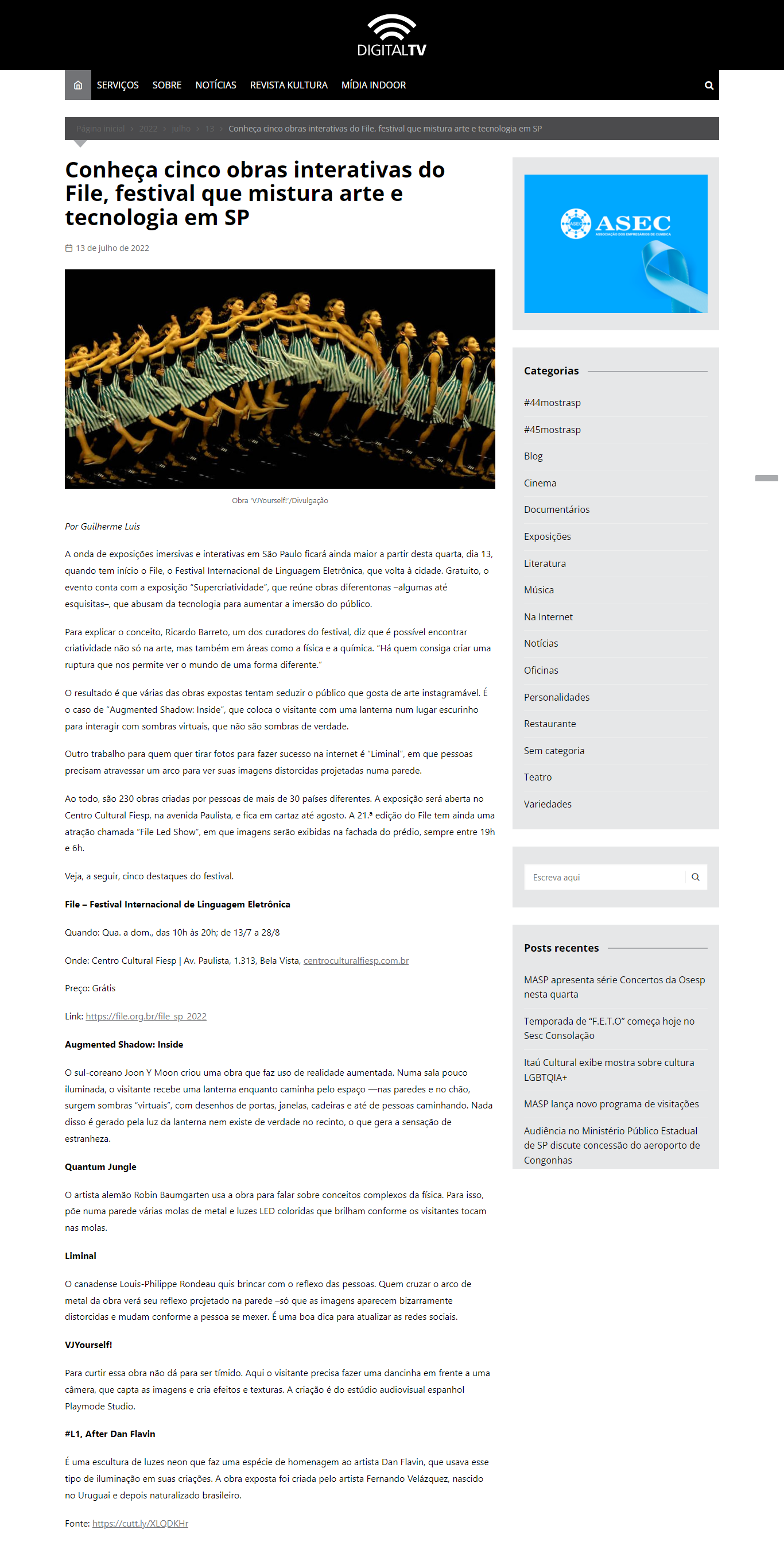 FILE SÃO PAULO 2022 – SUPERCRIATIVIDADE – Digital TV NomeFILE SÃO PAULO 2022 - SUPERCRIATIVIDADE - Digital TVAno (s) / Edição (ões)2022EventoFILE SÃO PAULO 2022DescriçãoFILE SÃO PAULO 2022 - SUPERCRIATIVIDADE Digital TV 13/07/2022 FILE SÃO PAULO 2022 - SUPERCRIATIVIDADE - Digital TV file-sao-paulo-2022-supercriatividade-digital-tv-imprensa Link ClippingDigital TV Evento: ["115675"]Educacional: []Obra Artística: []Participantes: [] Veja também: FILE SÃO PAULO 2022 FILE SÃO PAULO 2022 – SUPERCRIATIVIDADE – Paulista Flat Voltar para a lista Anterior Próximo