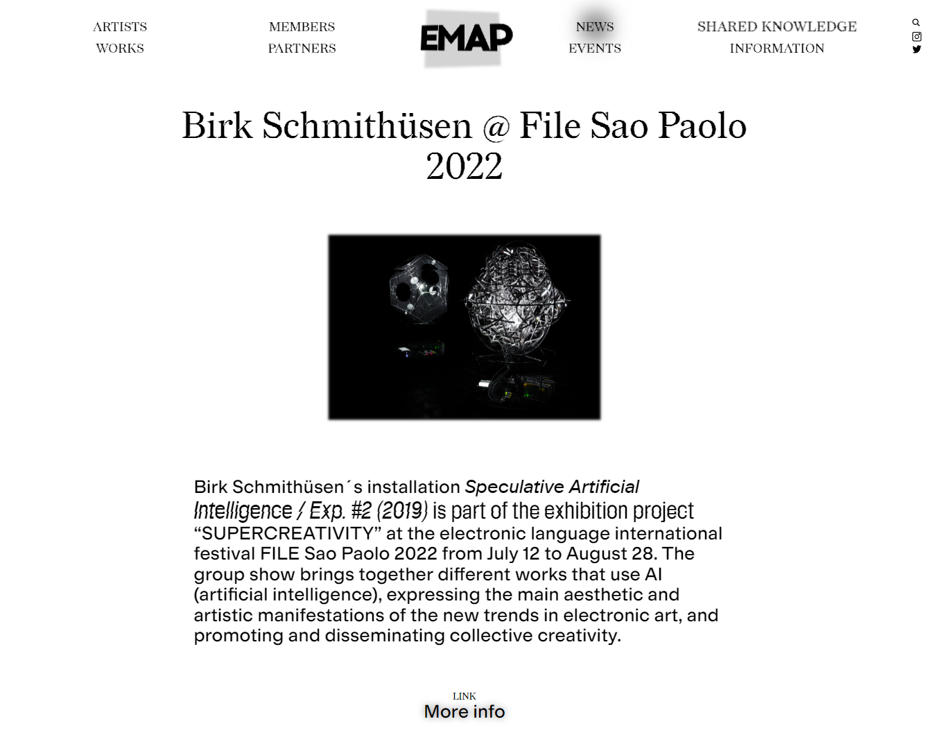 FILE SÃO PAULO 2022 – SUPERCRIATIVIDADE – European Media Art Platform NomeFILE SÃO PAULO 2022 - SUPERCRIATIVIDADE - European Media Art PlatformAno (s) / Edição (ões)2022EventoFILE SÃO PAULO 2022DescriçãoFILE SÃO PAULO 2022 - SUPERCRIATIVIDADE European Media Art Platform FILE SÃO PAULO 2022 - SUPERCRIATIVIDADE - European Media Art Platform file-sao-paulo-2022-supercriatividade-european-media-art-platform-imprensa Link ClippingEuropean Media Art Platform Evento: ["115675"]Educacional: []Obra Artística: []Participantes: [] Veja também: FILE SÃO PAULO 2022 FILE SÃO PAULO 2022 – SUPERCRIATIVIDADE – Paulista Flat Voltar para a lista Anterior Próximo