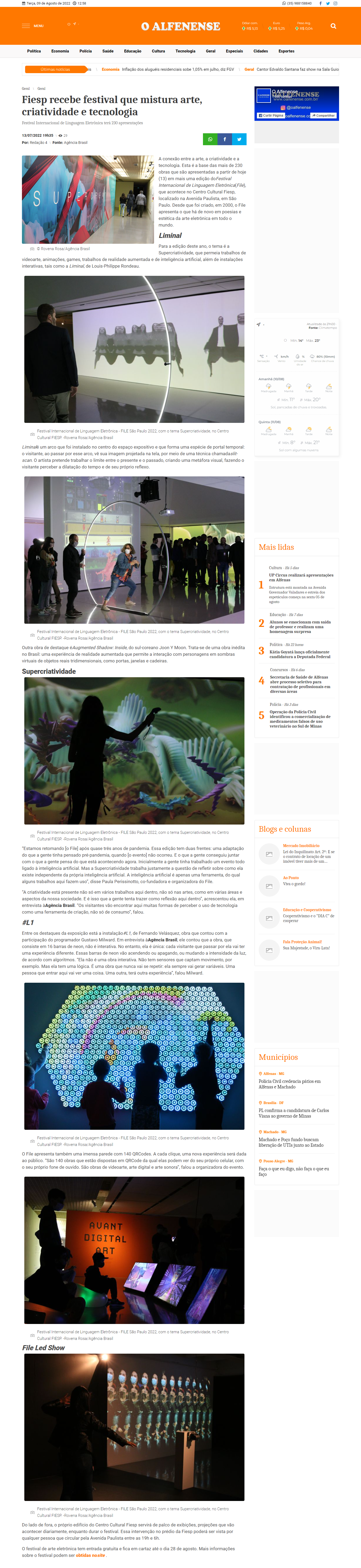 FILE SÃO PAULO 2022 – SUPERCRIATIVIDADE – O Alfenense NomeFILE SÃO PAULO 2022 - SUPERCRIATIVIDADE - O AlfenenseAno (s) / Edição (ões)2022EventoFILE SÃO PAULO 2022DescriçãoFILE SÃO PAULO 2022 - SUPERCRIATIVIDADE O Alfenense 13/07/2022 FILE SÃO PAULO 2022 - SUPERCRIATIVIDADE - O Alfenense file-sao-paulo-2022-supercriatividade-o-alfenense-imprensa Link ClippingO Alfenense Evento: ["115675"]Educacional: []Obra Artística: []Participantes: [] Veja também: FILE SÃO PAULO 2022 FILE SÃO PAULO 2022 – SUPERCRIATIVIDADE – Paulista Flat Voltar para a lista Anterior Próximo