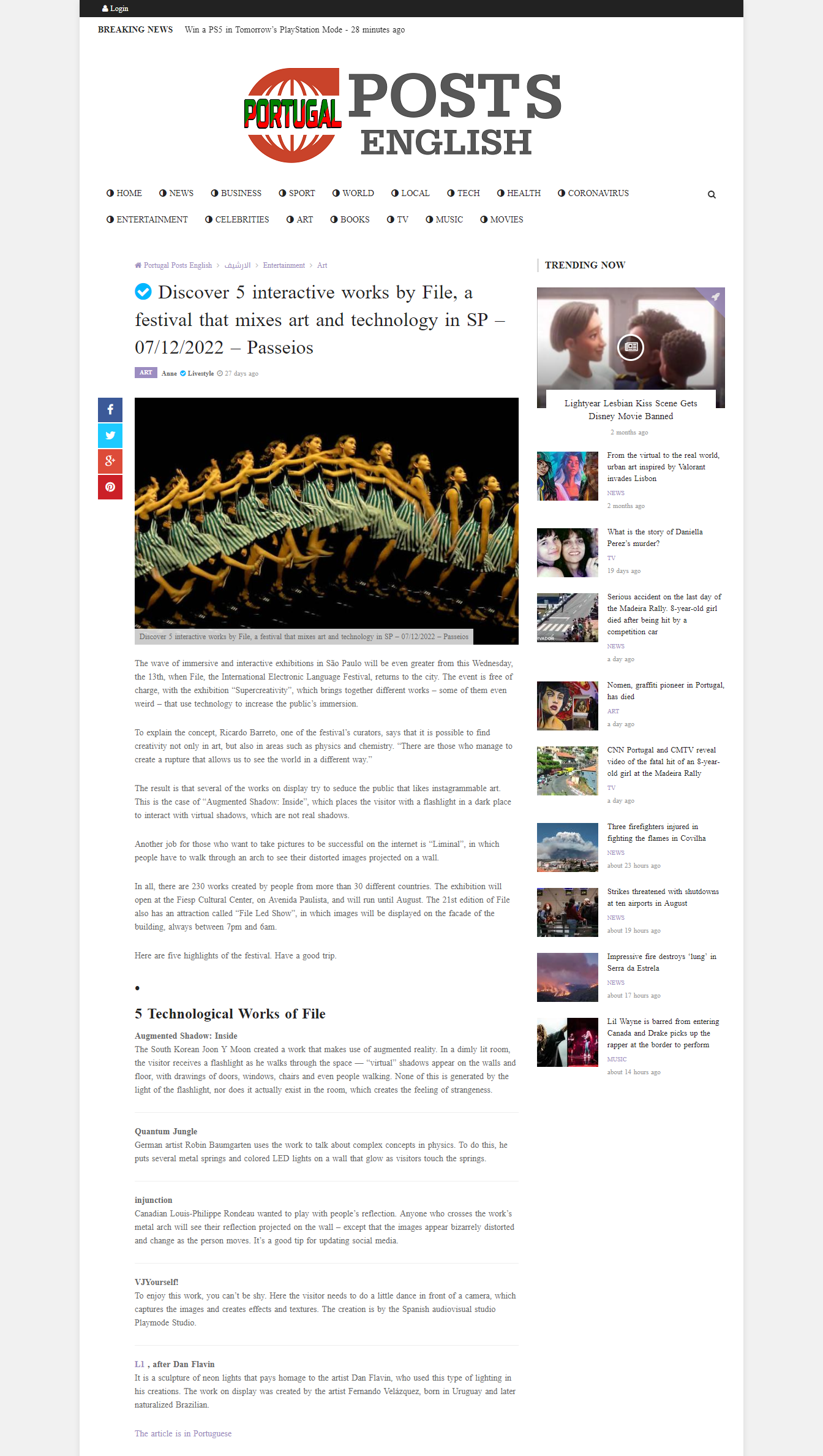 FILE SÃO PAULO 2022 – SUPERCRIATIVIDADE – Portugal Posts NomeFILE SÃO PAULO 2022 – SUPERCRIATIVIDADE - Portugal PostsAno (s) / Edição (ões)2022EventoFILE SÃO PAULO 2022DescriçãoFILE SÃO PAULO 2022 – SUPERCRIATIVIDADE Portugal Posts Discover 5 interactive works by FILE, a festival that mixes art and technology in SP 12/07/2022 FILE SÃO PAULO 2022 – SUPERCRIATIVIDADE - Portugal Posts file_sao_paulo_22_supercriatividade_portugal.posts DivulgaçãoClipping Evento: ["115675"]Educacional: []Obra Artística: []Participantes: [] Veja também: FILE SÃO PAULO 2022 FILE SÃO PAULO 2022 – SUPERCRIATIVIDADE – Paulista Flat Voltar para a lista Anterior Próximo