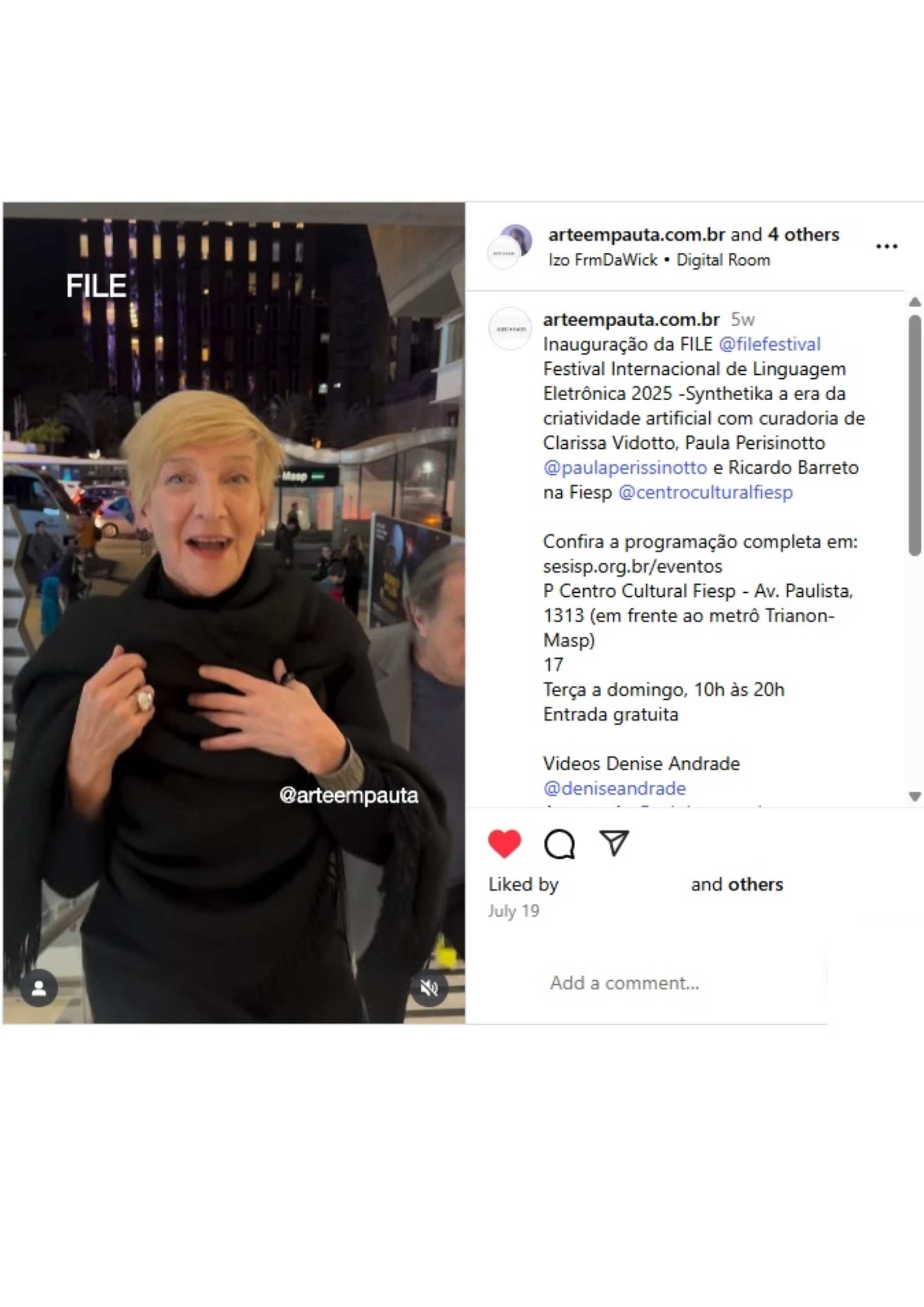 FILE SÃO PAULO 2025 – Instagram – Arte em Pauta – Post 2 NomeFILE SÃO PAULO 2025 - Instagram - Arte em Pauta - Post 2Ano (s) / Edição (ões)2025EventoFILE SÃO PAULO 2025Obra ArtísticaLost Communications 失絡之聲DescriçãoFILE SÃO PAULO 2025 Arte em Pauta - Post 2 Instagram 19/07/2025 FILE SÃO PAULO 2025 - Instagram Arte em Pauta: Abertura - Clipping file-sao-paulo-2025-arte-em-pauta-abertura-instagram-clipping DownloadFILE SÃO PAULO 2025 - Instagram Arte em Pauta - Post 2Link ClippingArte em Pauta - Post 2DivulgaçãoClipping | Clipping > Redes Sociais > Instagram | Imprensa > Online | Clipping > Redes Sociais Evento: ["471285"]Educacional: []Obra Artística: ["484265"]Participantes: [] Veja também: Lost Communications 失絡之聲 FILE SÃO PAULO 2025 – RSVP Voltar para a lista Anterior Próximo