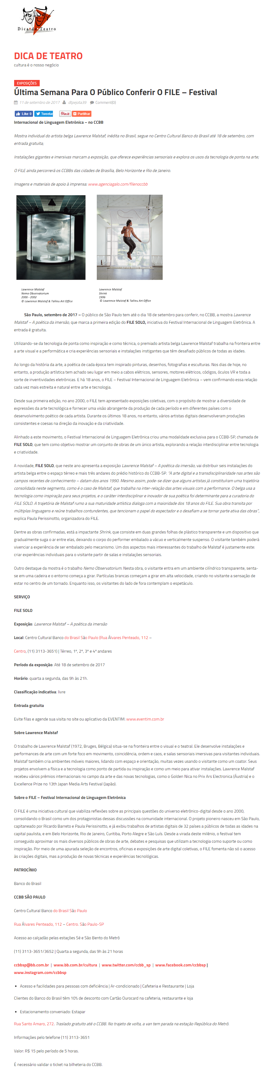 FILE SOLO 2017 – Dica de Teatro NomeFILE SOLO 2017 - Dica de TeatroAno (s) / Edição (ões)2017EventoFILE SOLO 2017DescriçãoÚltima Semana Para O Público Conferir O FILE – Festival Dica de Teatro - Online 11/09/2017 FILE SOLO2017 Última Semana Para O Público Conferir O FILE – Festival - Dica de Teatro - Online - 11/09/2017 FILE SOLO2017 FILE-São-Paulo-2017-Dica-de-teatro DivulgaçãoClipping | Imprensa > Revista > Online | Clipping > Revista Evento: ["39900"]Educacional: []Obra Artística: []Participantes: [] Veja também: FILE SOLO 2017 FILE SOLO 2017 – Áudio Guias Voltar para a lista Anterior Próximo