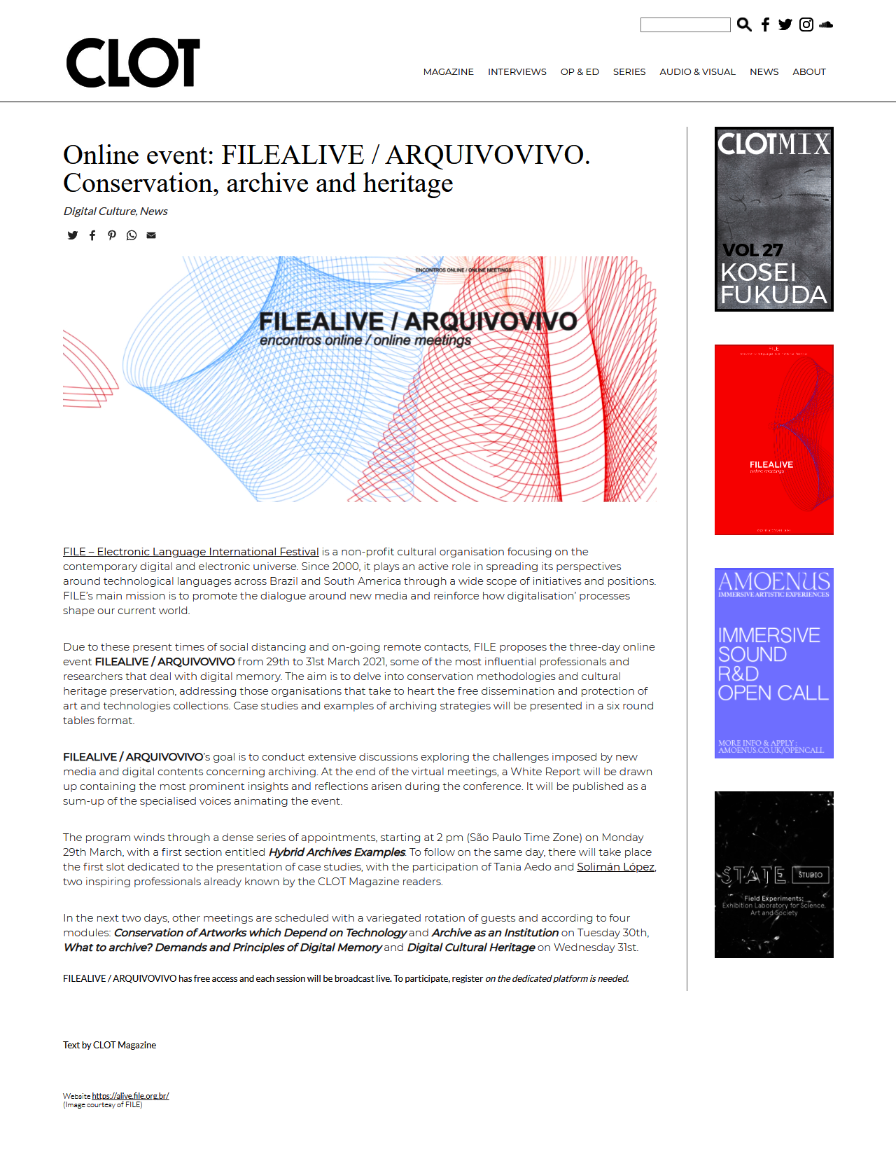 FILEALIVE / ARQUIVOVIVO – 2021 | Clot Magazine NomeFILEALIVE / ARQUIVOVIVO – 2021 | Clot MagazineAno (s) / Edição (ões)2021EventoFILE ALIVE / ARQUIVOVIVODescriçãoCLOT Magazine Online Event: FILEALIVE / ARQUIVOVIVO. Conservation, archive and heritage Digital Culture, News 28 Mar 2021 FILEALIVE / ARQUIVOVIVO – 2021 CLOT Magazine | Online Event: FILEALIVE / ARQUIVOVIVO. Conservation, archive and heritage clot_magazine_filealive_arquivovivo_2021 Link ClippingCLOT MagazineDivulgaçãoClipping | Imprensa > Revista > Online | Imprensa > Revista Evento: ["26462"]Educacional: []Obra Artística: []Participantes: [] Veja também: FILE ALIVE / ARQUIVOVIVO FILEALIVE / ARQUIVOVIVO – 2021 | SISEM-SP Voltar para a lista Anterior Próximo