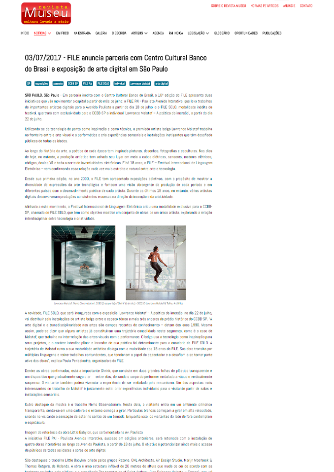 PAI 2017 – Clipping ( Planilha e Notícias) NomePAI 2017 - Clipping ( Planilha e Notícias)Ano (s) / Edição (ões)2017EventoFILE PAI 2017DescriçãoClipping ( Planilhas e Notícias) FILE PAI 2017 Paulista Avenida Interativa Downloadclipping | planilhaDivulgaçãoClipping Evento: ["38751"]Educacional: []Obra Artística: []Participantes: [] Veja também: FILE PAI 2017 FILE SOLO & FILE PAI 2017 – Revista Museu Voltar para a lista Anterior Próximo