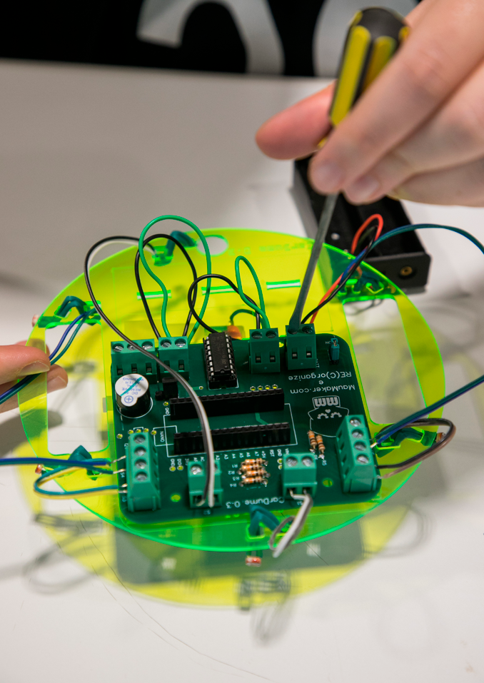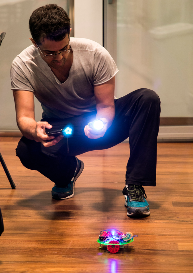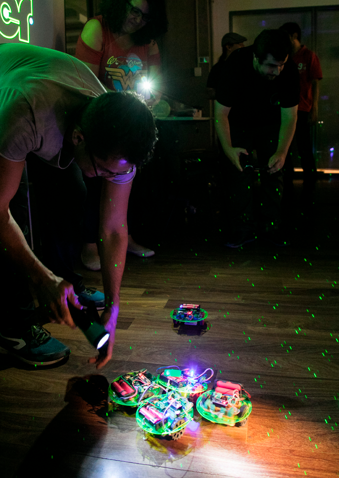 Os participantes constroem pequenos robôs com a capacidade de sentir o ambiente ao seu redor com sensores de luz a com o kit EmergentBots 2.0 que é fornecido.