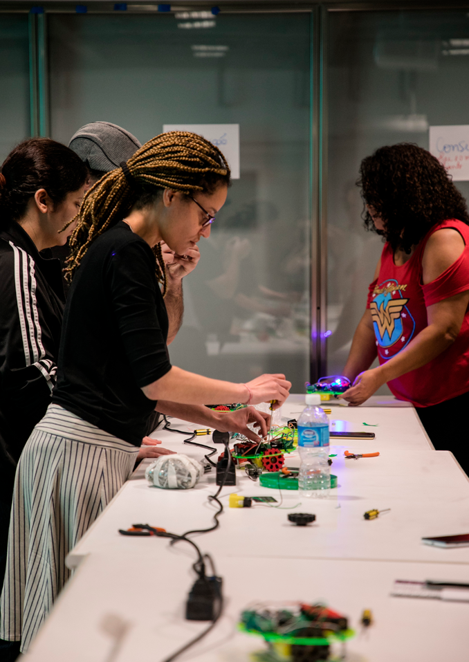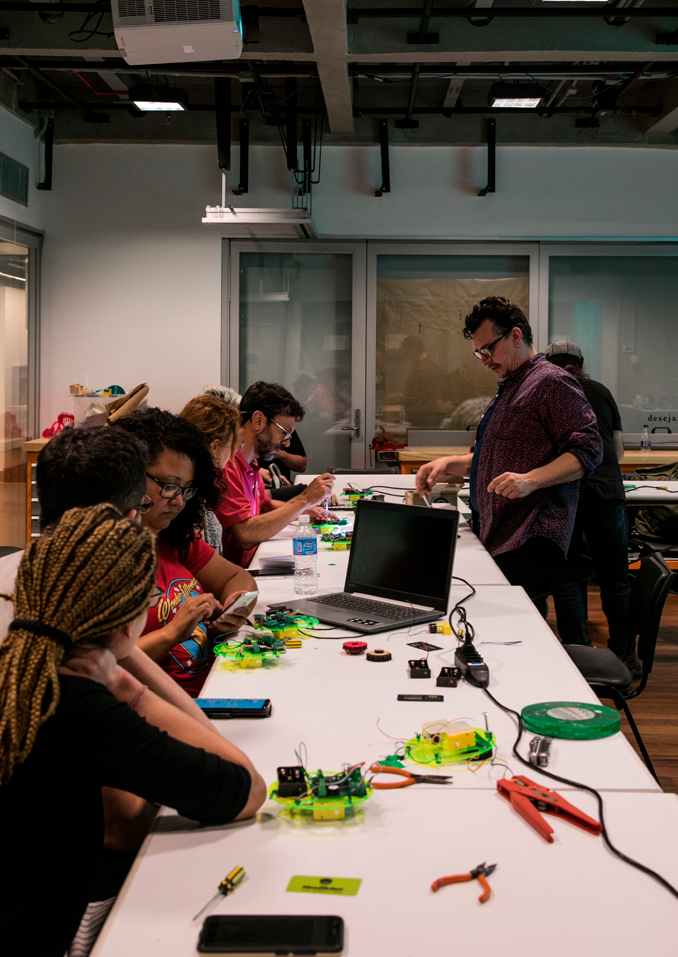A atividade consiste em uma oficina de montagem de robôs seguida de exposição interativa dos robôs montados trabalhando colaborativamente e reagindo ao ambiente.