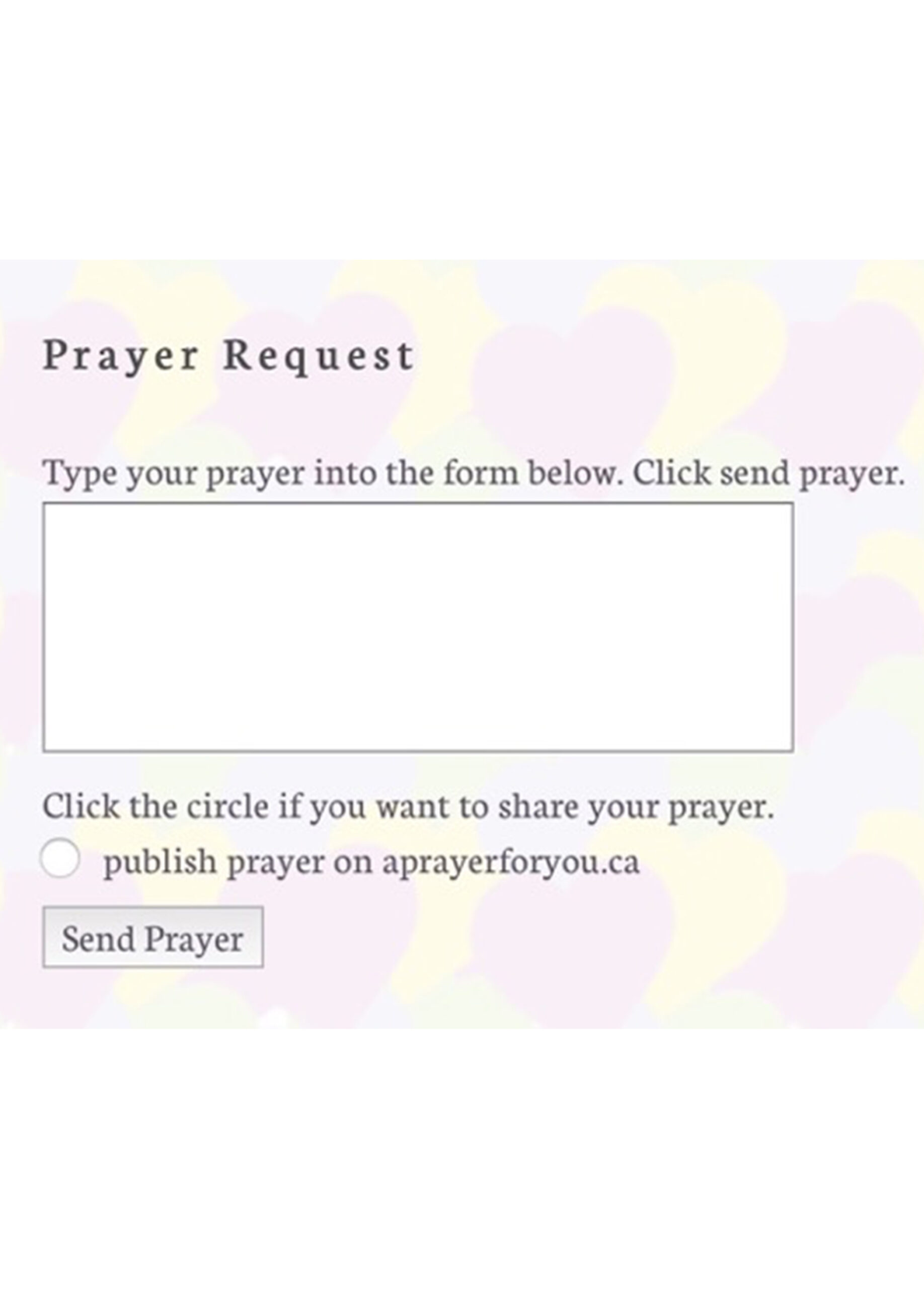 Escreva um pedido de oração no formulário e clique em “send prayer”. Suas preces serão recebidas e alguém rezará por você. Nenhum pedido é negado. Pode-se pedir uma prece por qualquer coisa, por qualquer um.