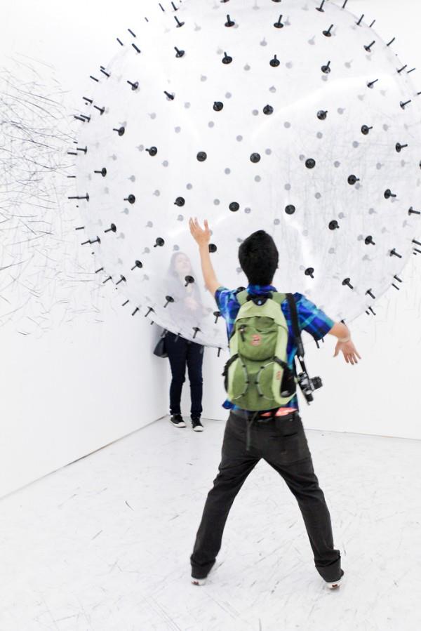 Semelhante à “Méta-Matics” de Tinguely, “ADA” é uma obra de arte com alma. Ela se interpreta. Em Tinguely, basta ser uma entidade mecânica lutando inconscientemente. Ele levou a coisa de maneira bem humorada: a máquina produz apenas sua autodestruição industrial. Enquanto “ADA”, de Karina Smigla-Bobinski, é uma “criatura” pós-industrial, animada pelo visitante, uma escultura-artista que atua criativamente, uma obra de arte autoinformante, que se assemelha a um híbrido molecular, como da nanobiotecnologia. Ela desenvolve os mesmos híbridos rotativos de carbono-silício, ferramentas anãs, máquinas miniaturas capazes de gerar estruturas simples. “ADA” é muito maior, esteticamente muito mais complexa, uma máquina de fazer arte interativa. Cheio de hélio, flutuando livremente na sala, um globo transparente parecido com uma membrana, com pontas de carvão que deixam marcas nas paredes, teto e piso. Marcas que “ADA” produz de modo autônomo, embora movida pelo visitante. O globo obtém uma aura de vivacidade e seus traços de carvão preto, a aparência de um desenho. O globo colocado em ação fabrica uma composição de linhas e pontos que permanecem incalculáveis em sua intensidade, expressão, forma, por mais que o visitante tente controlar “ADA”, conduzi-la, domesticá-la. Qualquer coisa que ele tente, perceberá muito cedo que “ADA” é uma performer independente, marcando as paredes originalmente brancas com desenhos e signos. Surgem estruturas de textura cada vez mais complexas. É um movimento experimentado visualmente, que como um computador faz uma produção imprevisível depois da entrada de um comando. Não por acaso, “ADA” lembra Ada Lovelace, que no século 19, juntamente com Charles Babbage, desenvolveu o primeiro protótipo de computador. Babbage forneceu a máquina de computação preliminar, Lovelace o primeiro software. Uma simbiose de matemática com o legado romântico de seu pai, Lorde Byron, surgiu ali. Ada Lovelace tentou criar uma máquina que seria capaz de criar obras de arte como poesia, música ou imagens, como um artista. “ADA” de Karina Smigla-Bobinski se situa nessa mesma tradição, assim como na de Vannevar Bush, que construiu uma máquina Memex (Memory Index) em 1930 (“Queríamos que o memex se comportasse como a rede intricada de traços transportados pelas células do cérebro”), ou o tear de Jacquard, que para tecer flores e folhas precisava de um cartão perfurado; ou a “máquina analítica” de Babbage, que extraiu padrões algorítmicos. “ADA” surgiu no espírito atual da biotecnologia. Ela é uma máquina de performance vital, e seus padrões de linhas e pontos ficam cada vez mais complexos conforme o número de espectadores-atores aumenta. Deixando traços que nem a artista nem os visitantes são capazes de decifrar, para não falar na própria “ADA”. Ainda assim, o trabalho de “ADA” tem inconfundivelmente um potencial humano, porque o único método de decodificação disponível para esses signos e desenhos é a associação que nosso cérebro corresponde ao máximo quando dorme: a truculenta vivacidade de nossos sonhos.