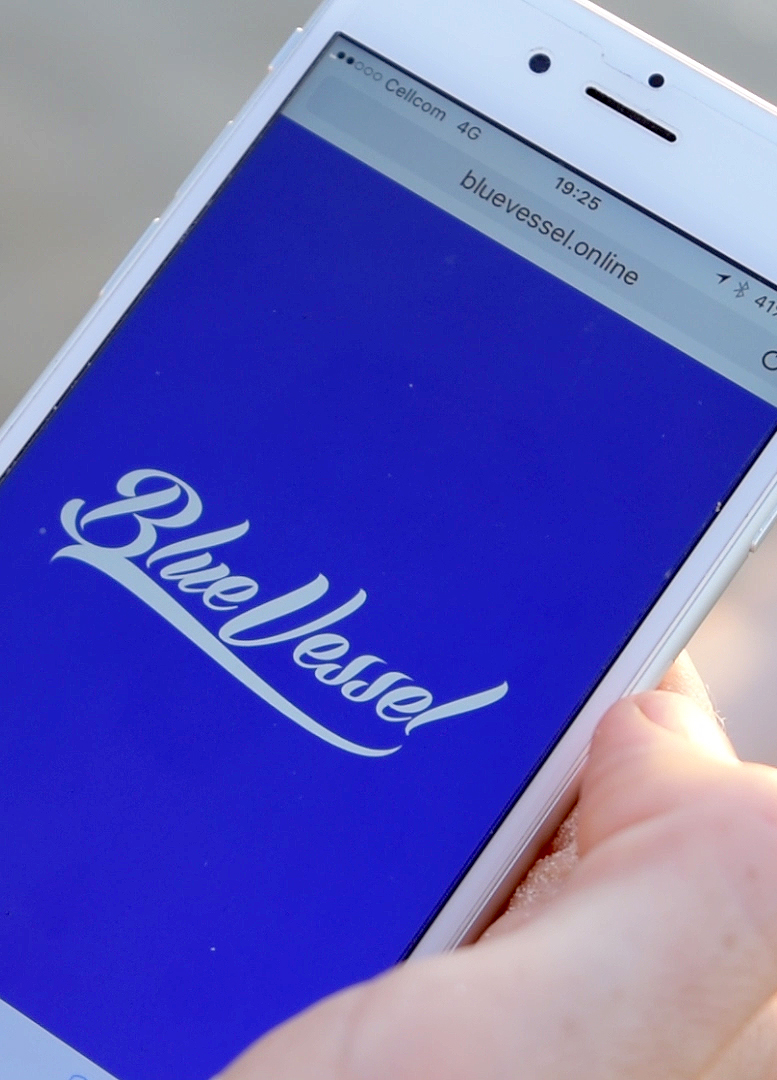 “Blue Vessel” é um aplicativo móvel da web que cria uma delineada experiência de navegação de conhecimento e histórias de conquista e sobrevivência. Hospedado em um servidor localizado num navio sem bandeira, à deriva em águas internacionais, o aplicativo convida os usuários a escrever mensagens anônimas selecionando palavras exclusivamente do livro “Robinson Crusoe”, de Daniel Defoe. A mensagem escrita torna-se então uma URL a ser encontrada por acaso por um espectador desavisado ou nunca encontrado. Como uma “mensagem em uma garrafa” contemporânea, as palavras são enviadas com a esperança de serem encontradas; é dentro dessa periferia que o ato de enviar informações torna-se fútil e as questões de serem lidas ou nunca lidas ficam em estado de limbo. Além disso, o usuário pode aprender habilidades de sobrevivência de links de sites em um navegador que se decompõe a cada movimento de rolagem. Embora os links ainda estejam ativos e acessíveis, as letras na tela flutuam e esbarram umas nas outras, tornando-se ilegíveis.