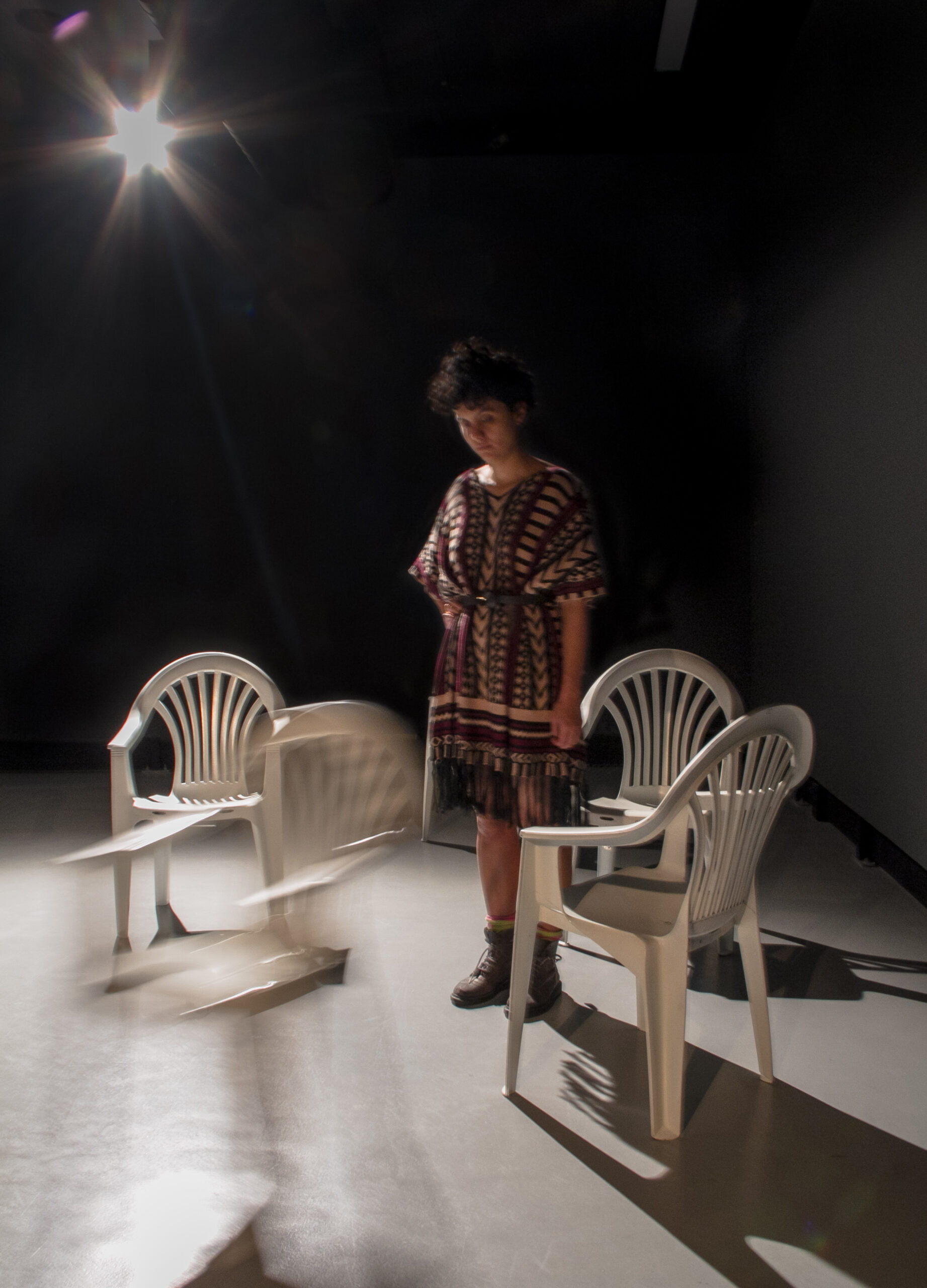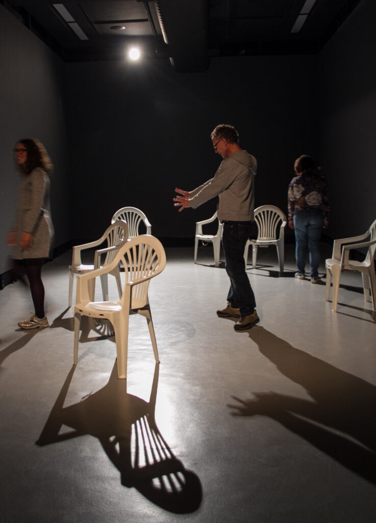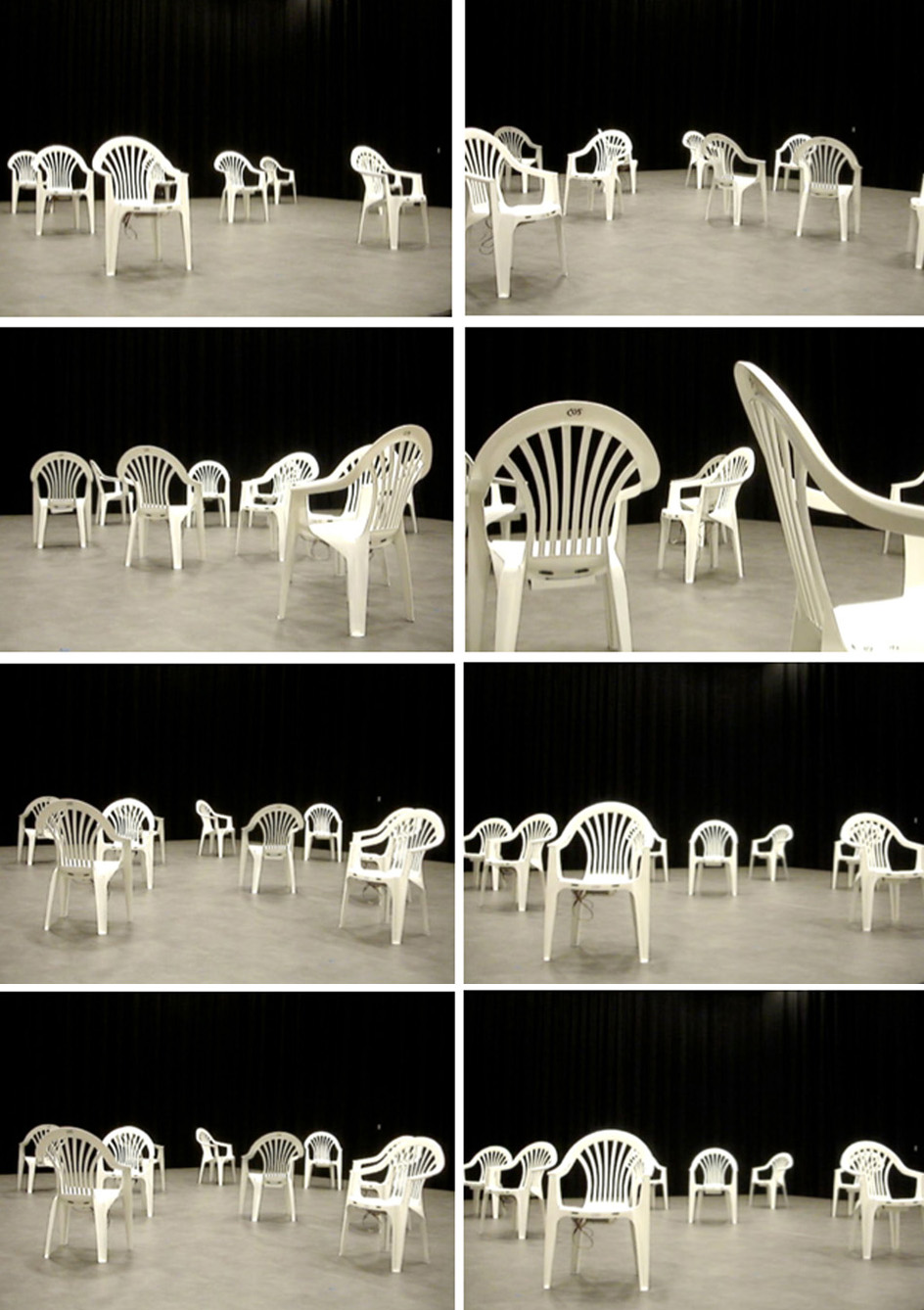 Um par de cadeiras vibratórias está se movendo e girando lenta e aleatoriamente através do espaço. Elas parecem procurar e rejeitar umas às outras com zumbidos suaves. Quando um visitante passa, as cadeiras hesitam e, cuidadosamente, experimentam padrões diferentes. Os padrões não são projetados; é um sistema auto-organizado onde novas composições e novos comportamentos surgem espontaneamente durante a duração da instalação.