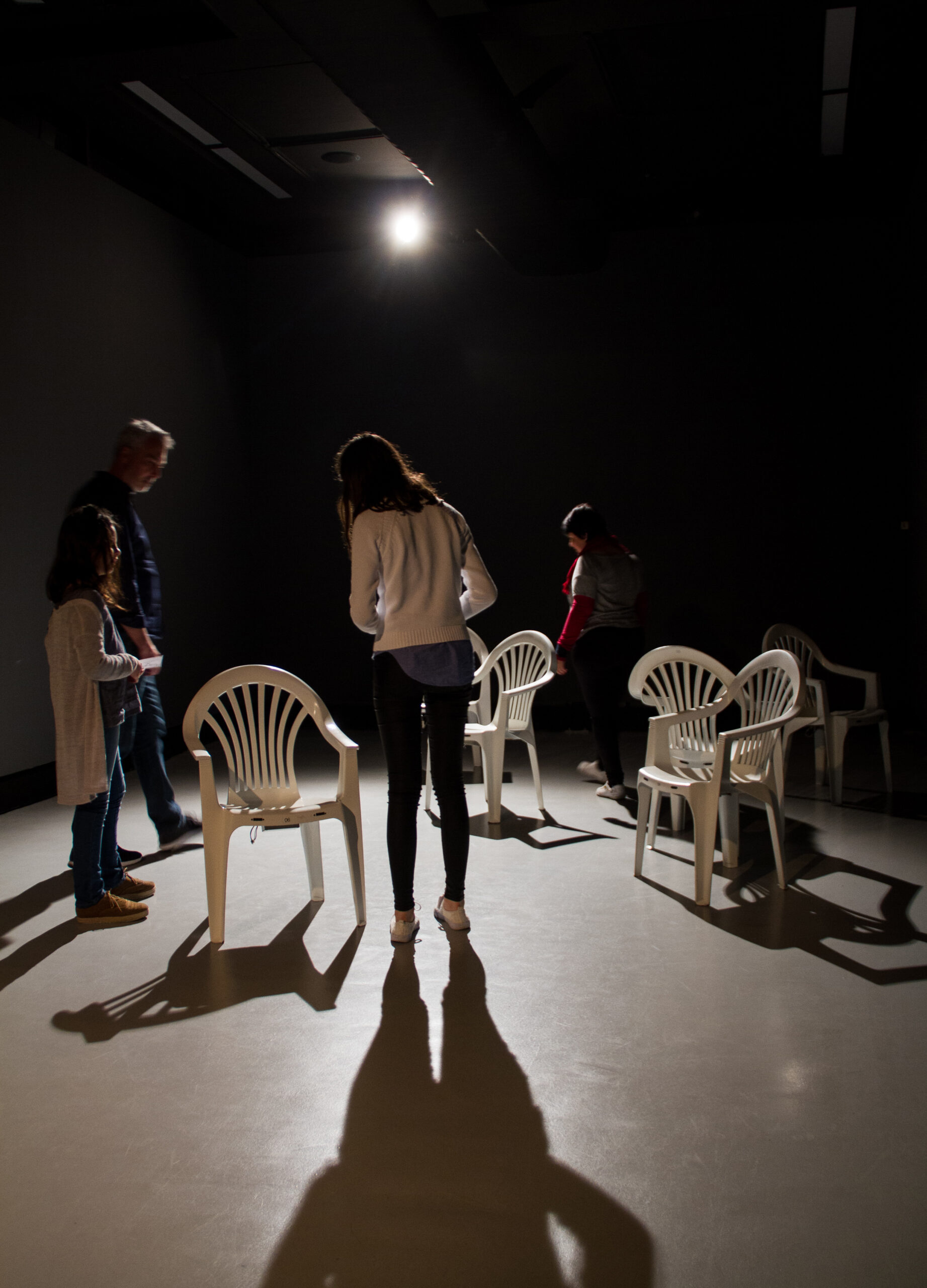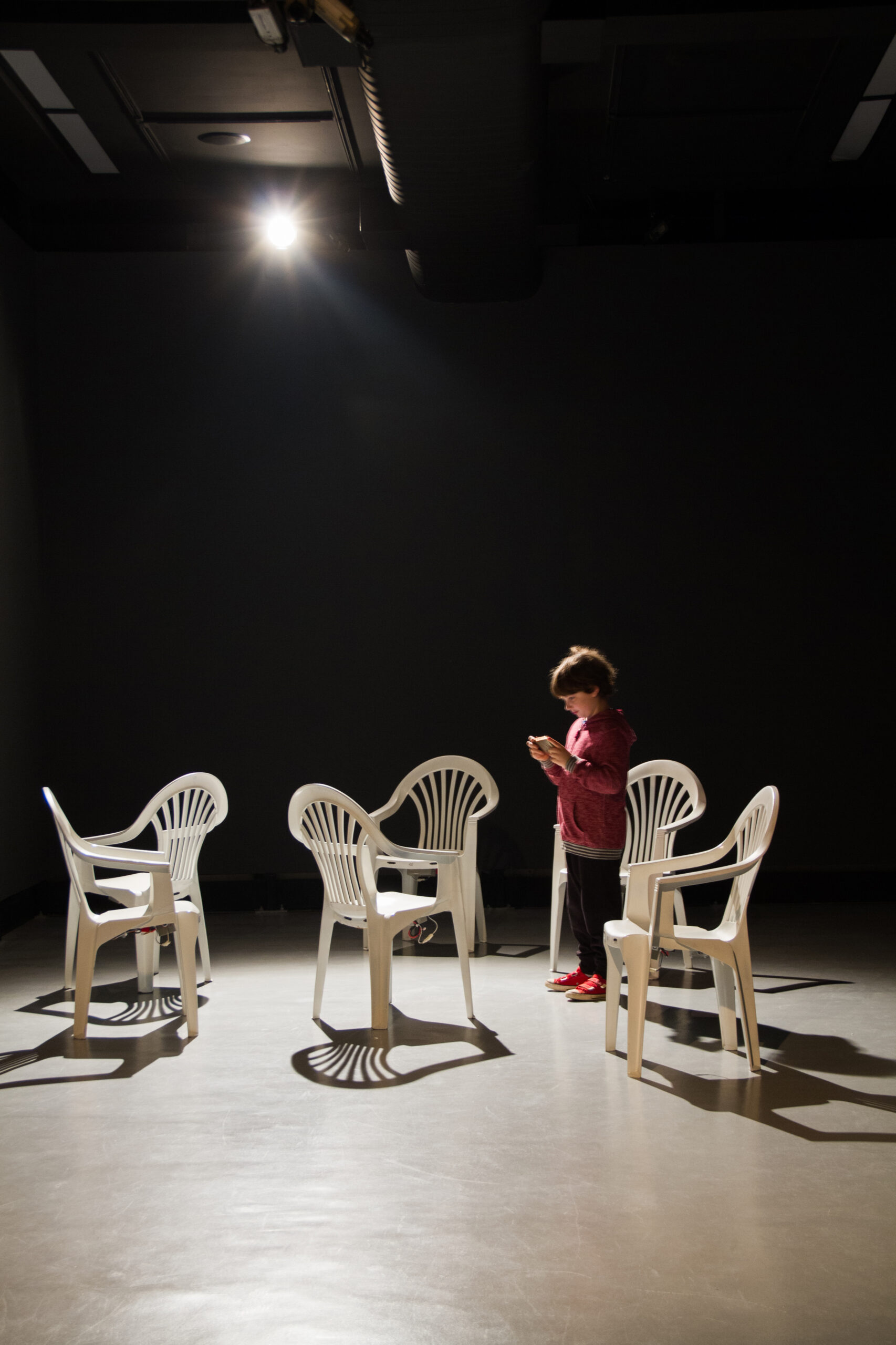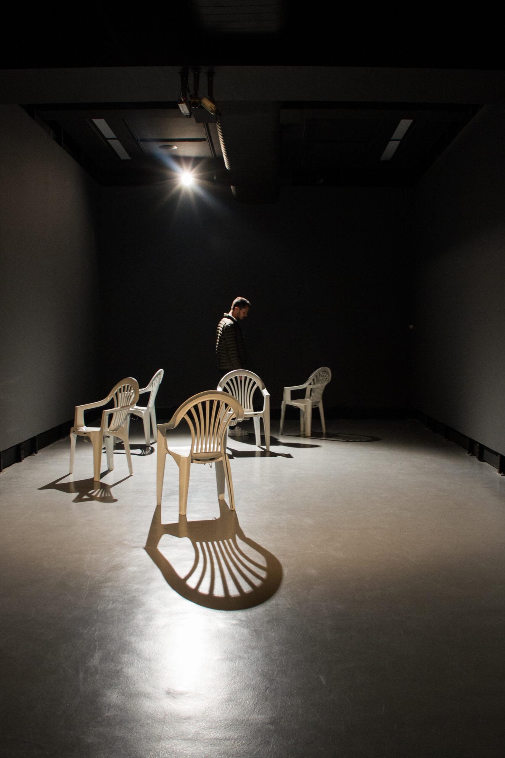 Um par de cadeiras vibratórias está se movendo e girando lenta e aleatoriamente através do espaço. Elas parecem procurar e rejeitar umas às outras com zumbidos suaves. Quando um visitante passa, as cadeiras hesitam e, cuidadosamente, experimentam padrões diferentes. Os padrões não são projetados; é um sistema auto-organizado onde novas composições e novos comportamentos surgem espontaneamente durante a duração da instalação.