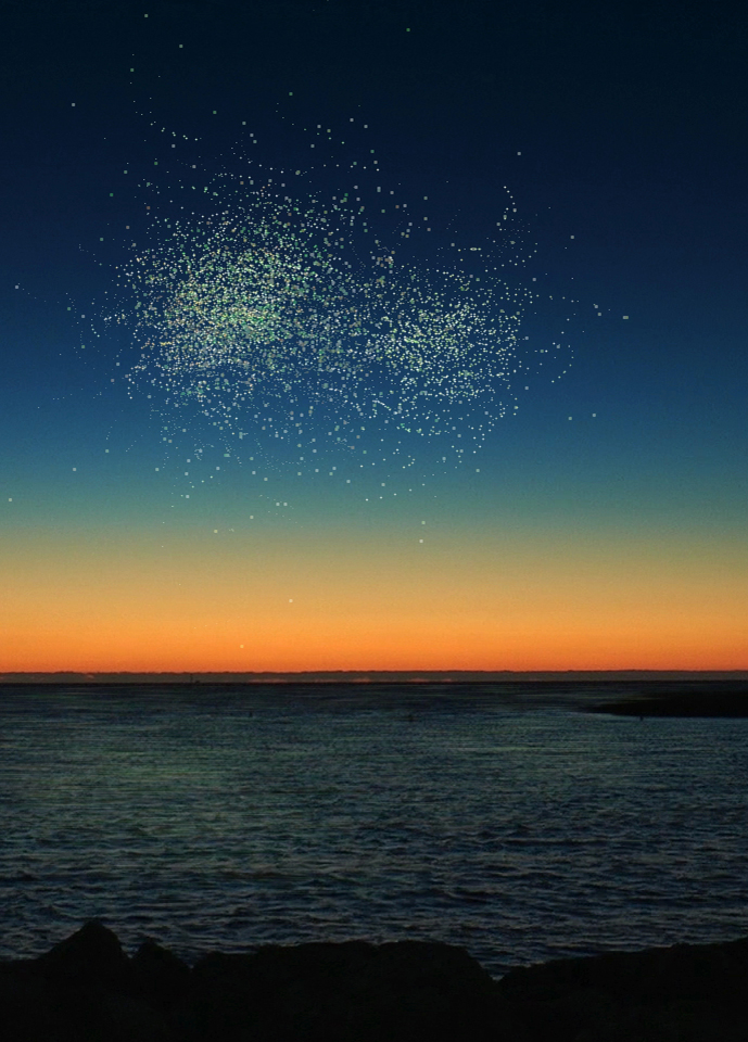 Encontro audiovisual inesperado ao pôr do sol, em que o céu é iluminado por estranhas luzes que interagem com uma música generativa.