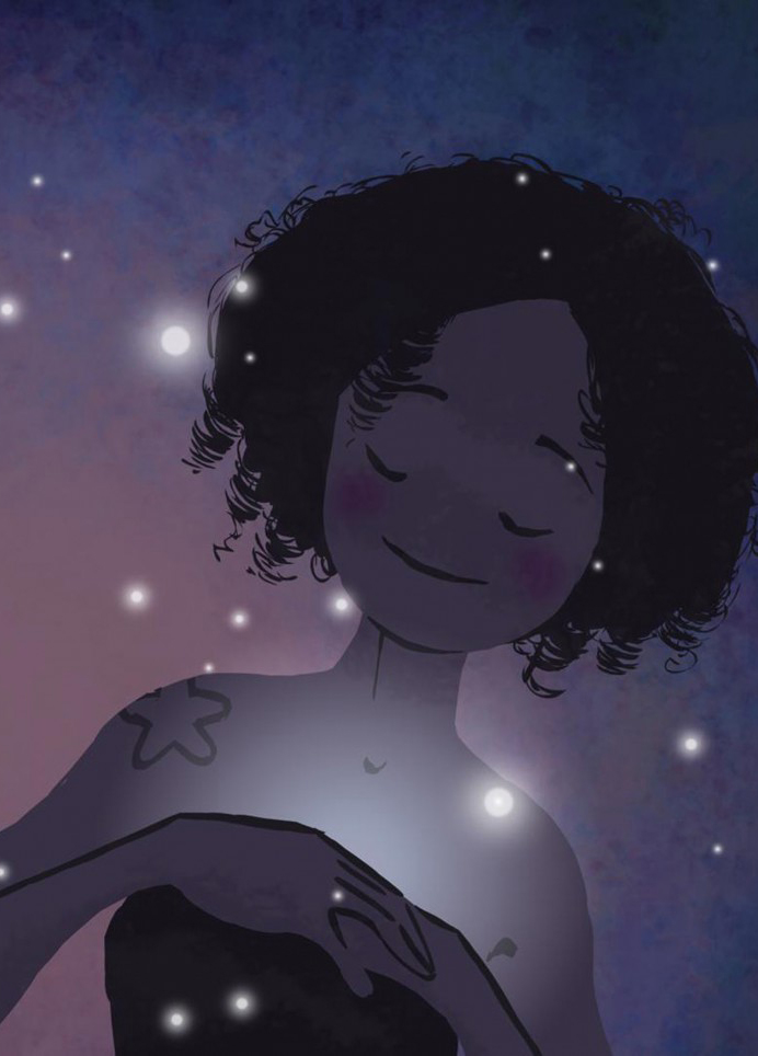 Uma mulher vaga entre as estrelas num poema visual para a metáfora do coração apaixonado.