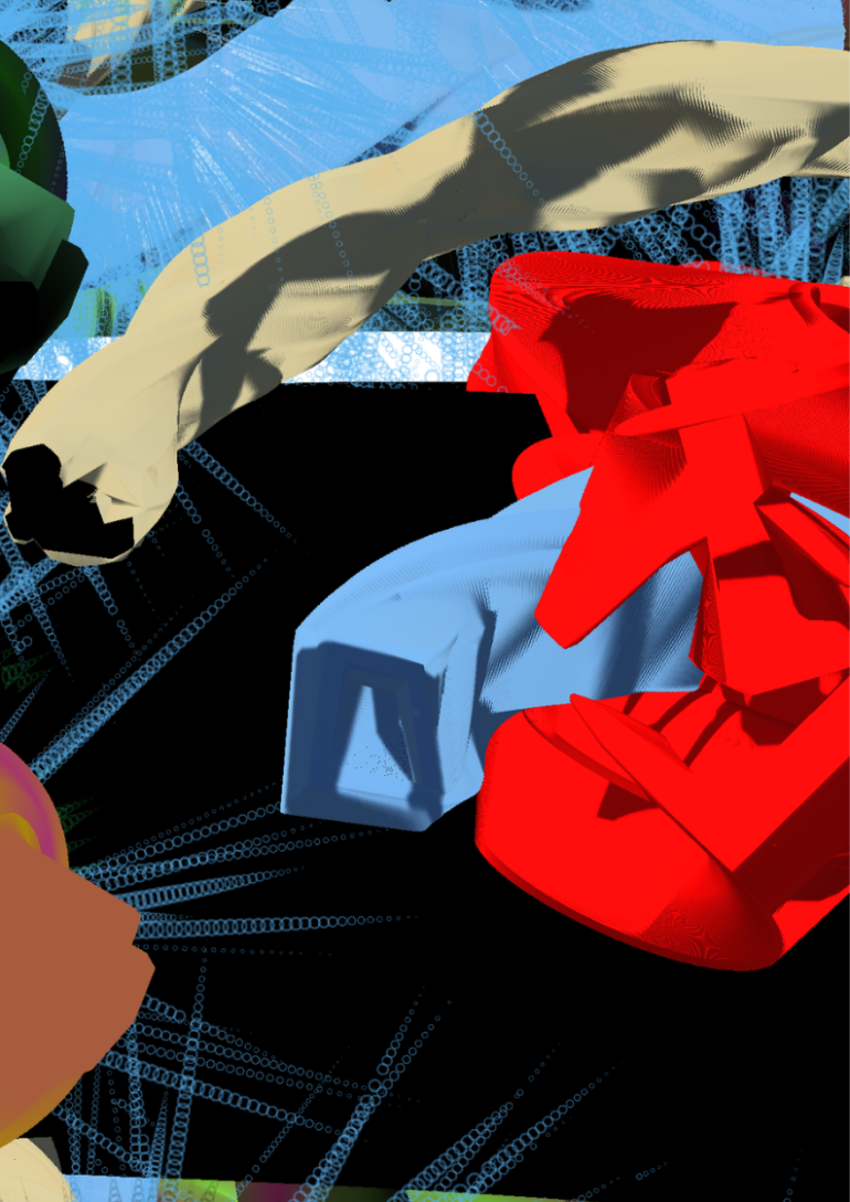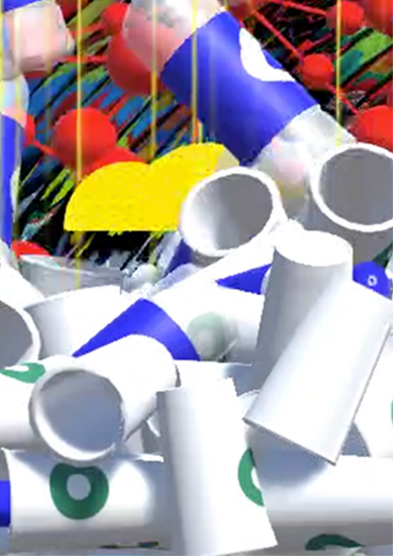 Esta animação é inspirada em kimonos sobrepostos e padronizados, com frequência encontrados em gravuras no estilo ukiyo-e. A animação cria uma série de padrões em movimento ao longo do tempo. Para conectar a animação às dinâmicas do mundo real, imaginei um mundo digital intocado sendo destruído por garrafas plásticas e copos de café jogados fora.