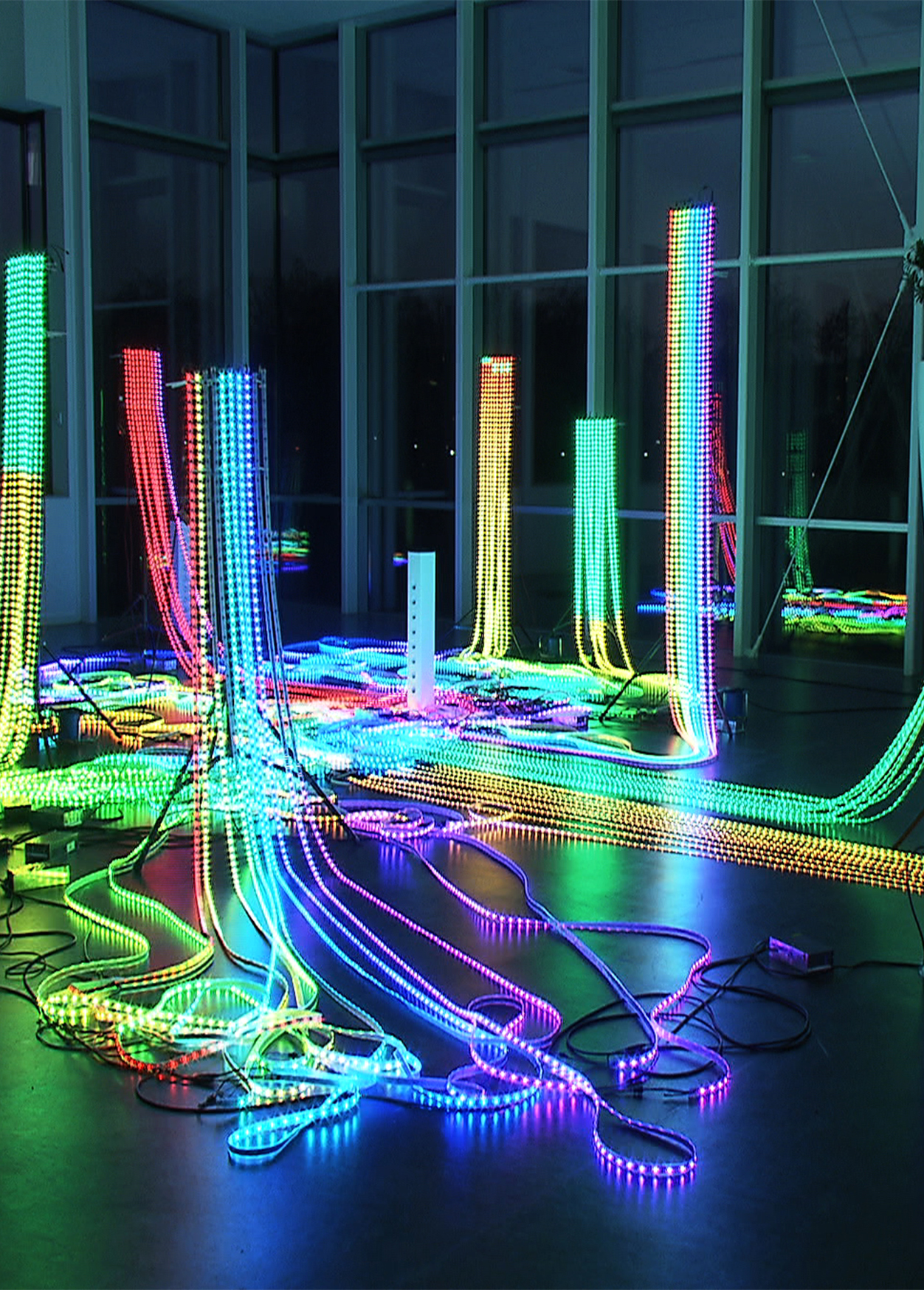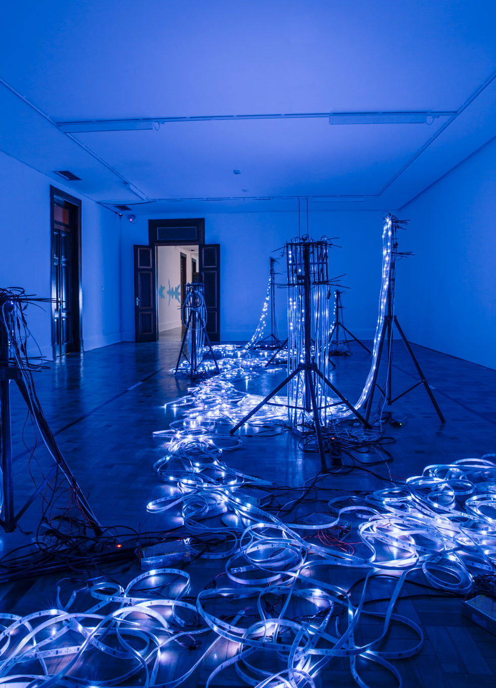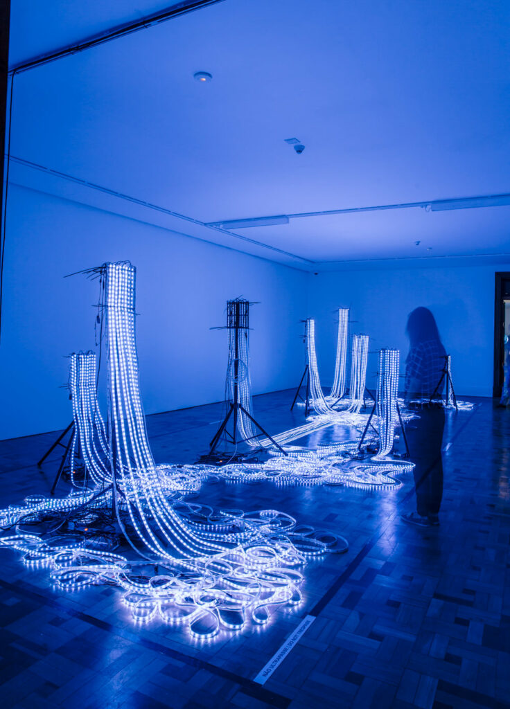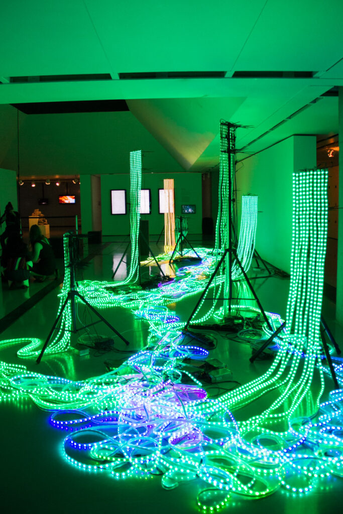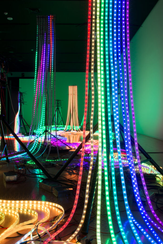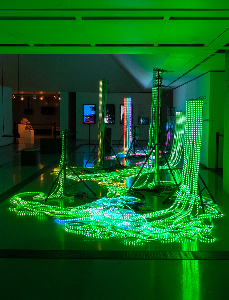 “Hardwired” consiste em cerca de 18.000 luzes LED que simbolizam a transferência de conhecimento. Pixels luminosos individuais se conectam e então desaparecem. Num processo de transformação constante, surgem novos padrões, inter-relações e complexidades.