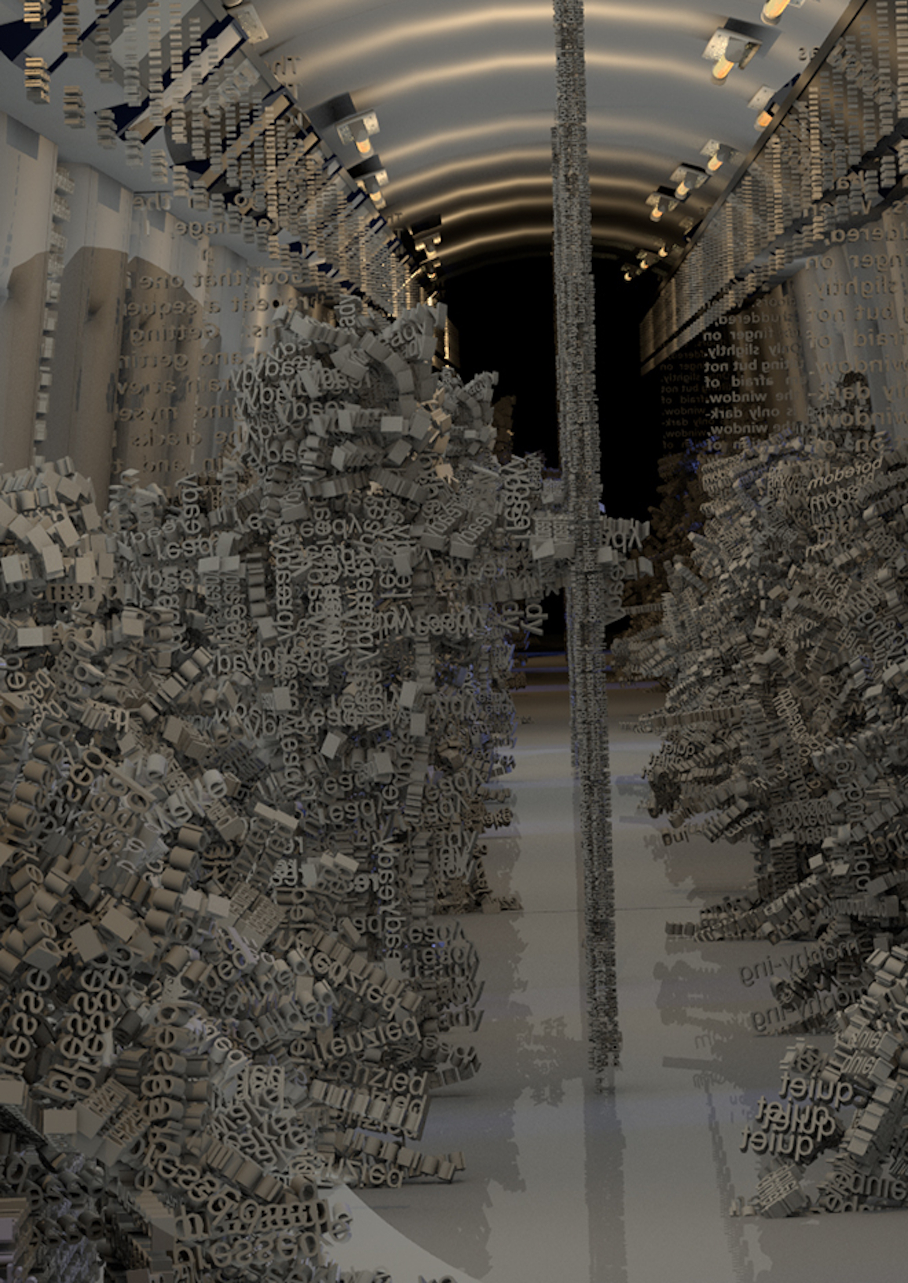 À medida que nos colocamos em um modo de “piloto automático”, nos desconectamos de nosso entorno. Esses espaços contêm quietude, indiferença, devaneios, resistência e ociosidade. O trabalho apresenta um vagão de trem sombrio cheio de avatares sem rosto e pedaços caóticos de texto. Descreve o trajeto como uma experiência liminar entre chegadas e partidas.