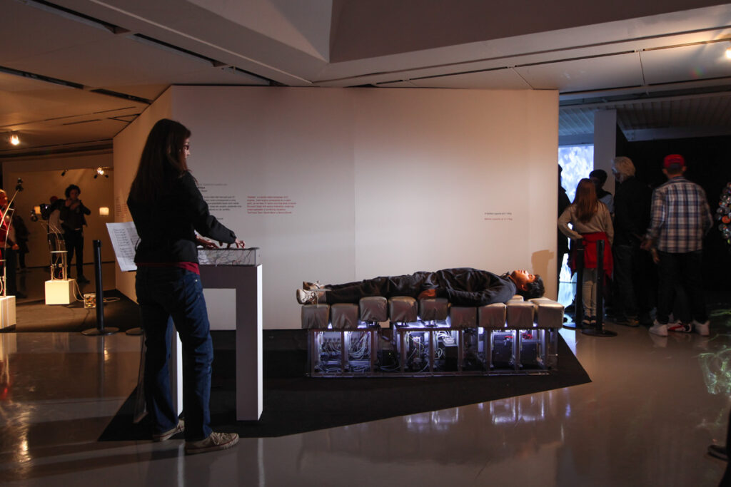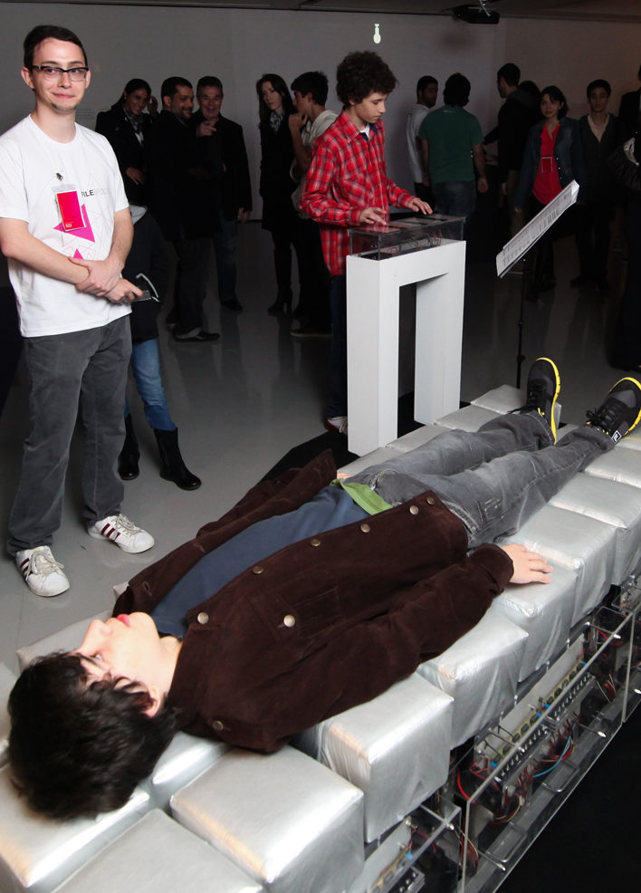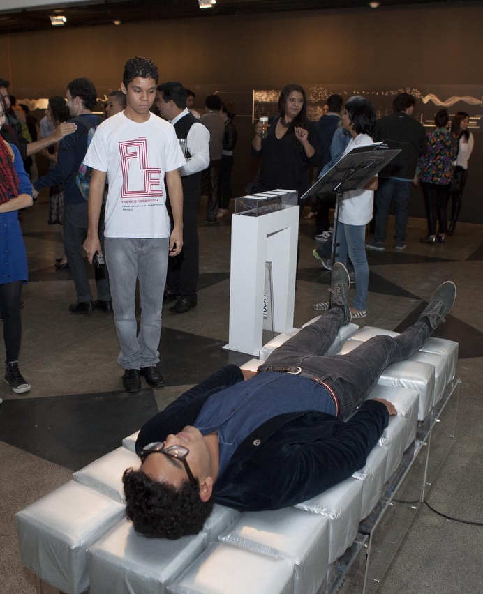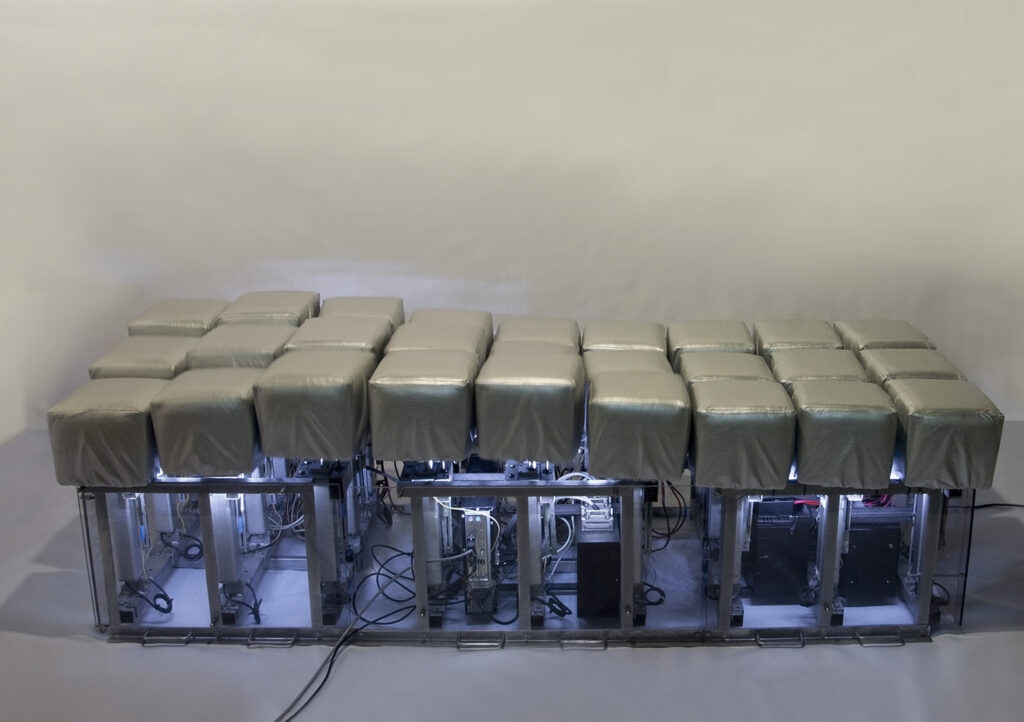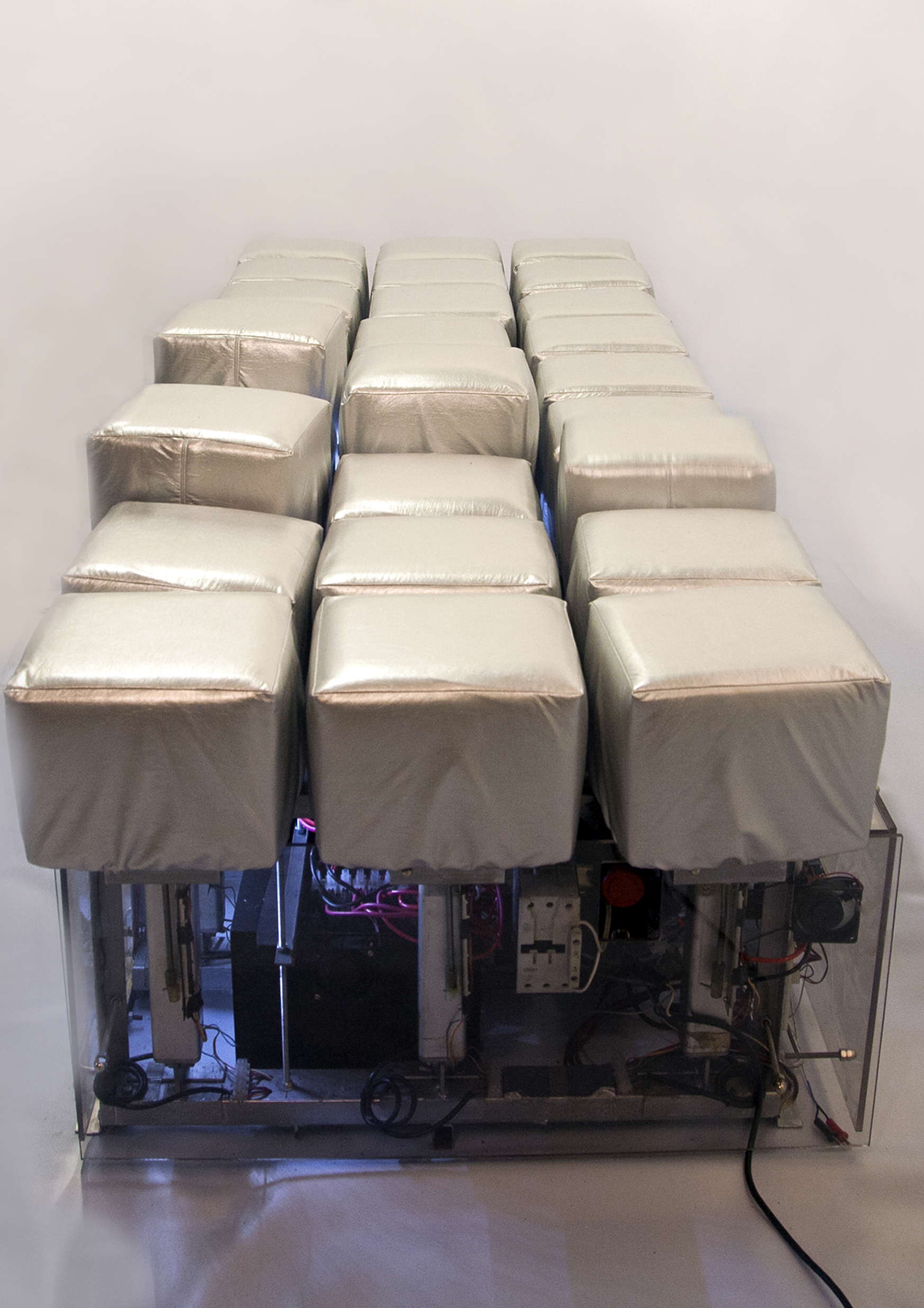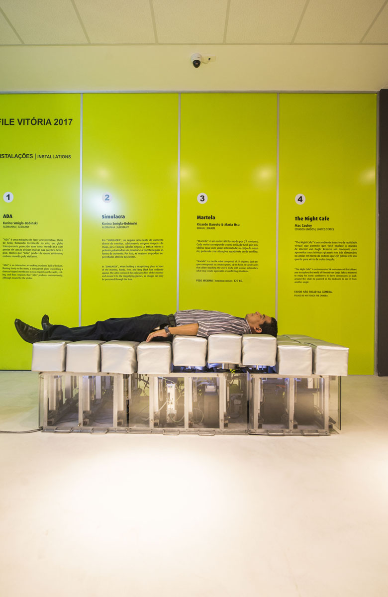 A primeira máquina tátil se chama “Martela”, um robô tátil formado por 27 motores subdivididos por três quadrados (3×3), ou seja, cada quadrado possui 9 motores. Cada motor corresponde a um ponto em matriz e temos assim 27 unidades táteis que possibilitam tocar com várias intensidades o corpo do usuário.