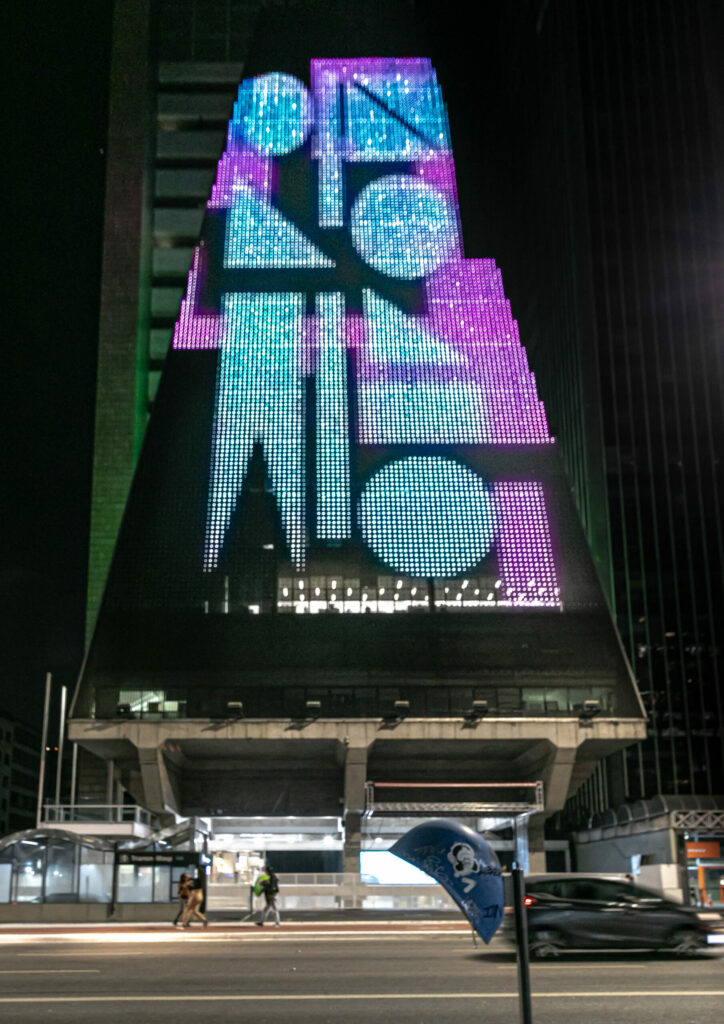 A expressão em inglês AI é chamada ‘인공지능’ em Coreano. Eu separo e padronizo a expressão ‘인공지능’ para criar cada forma única, então pixelizo/digitalizo para produzir uma série de imagens transfigurantes dinâmicas e, ao mesmo tempo, combinações regulares e uniformes.