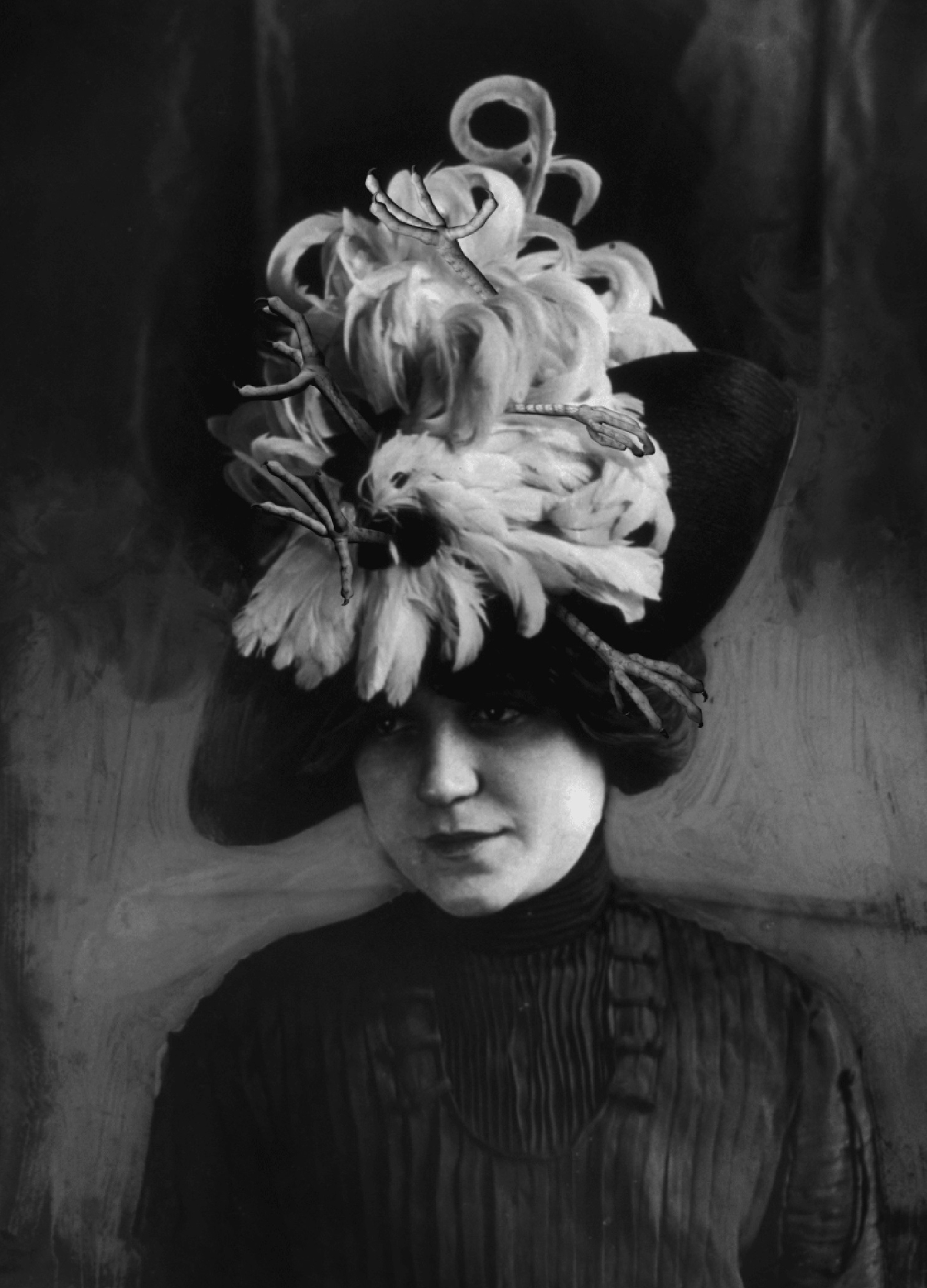 Foto de Arquivo: Cabeça e ombros de modelo vestindo chapéu de penas “Chanticleer” (1912). Library of Congress.