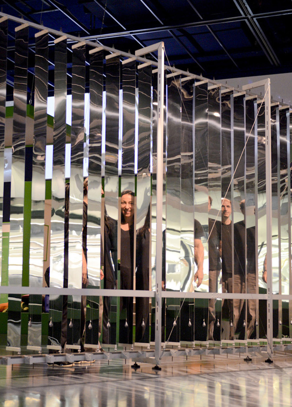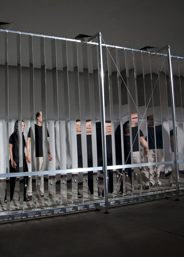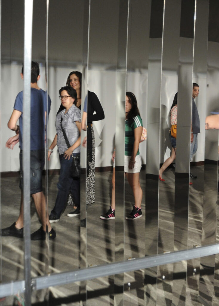 “PAREDE” é uma escultura cinética, interativa, composta de 45 placas de alumínio espelhado que, em cadeia, rotacionam 180°. O efeito em cadeia ocorre em função das ações dos visitantes. Como na brincadeira com dominós, a passagem de um interator por uma das extremidades da instalação aciona um mecanismo de movimento; as placas giram, uma a uma até que todas sejam rotacionadas.
