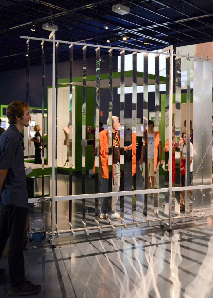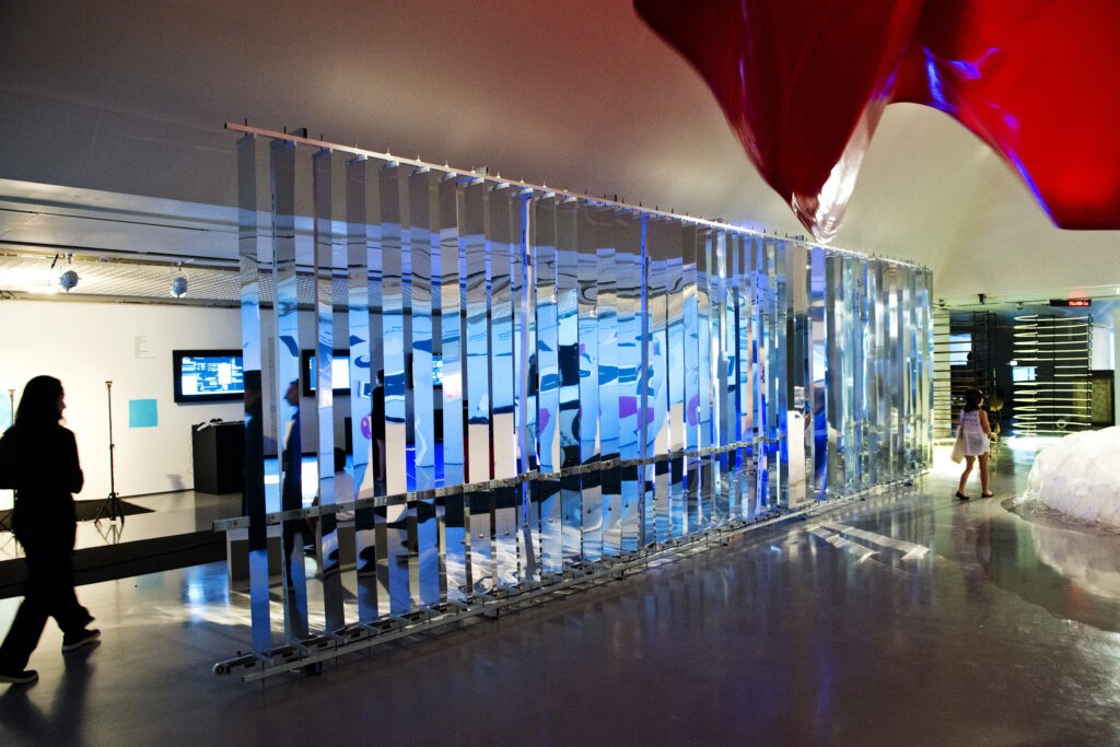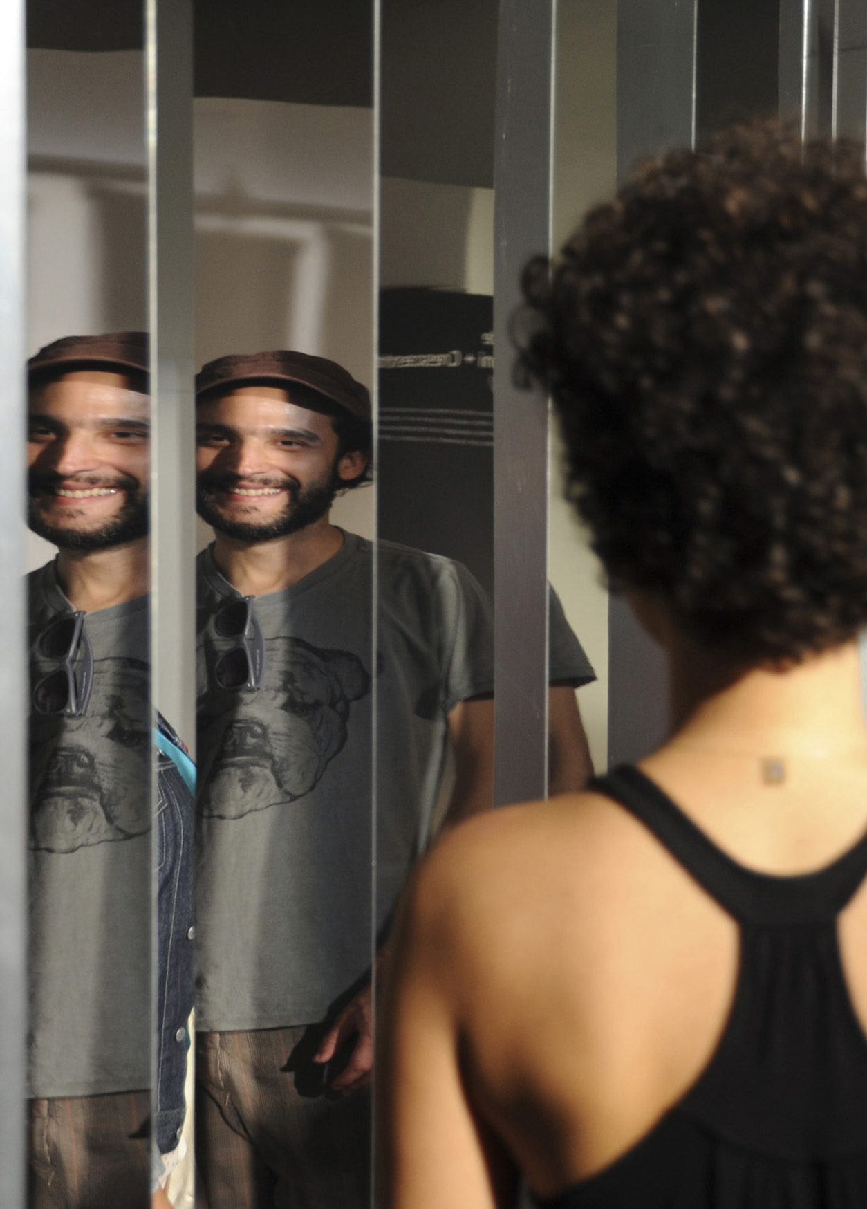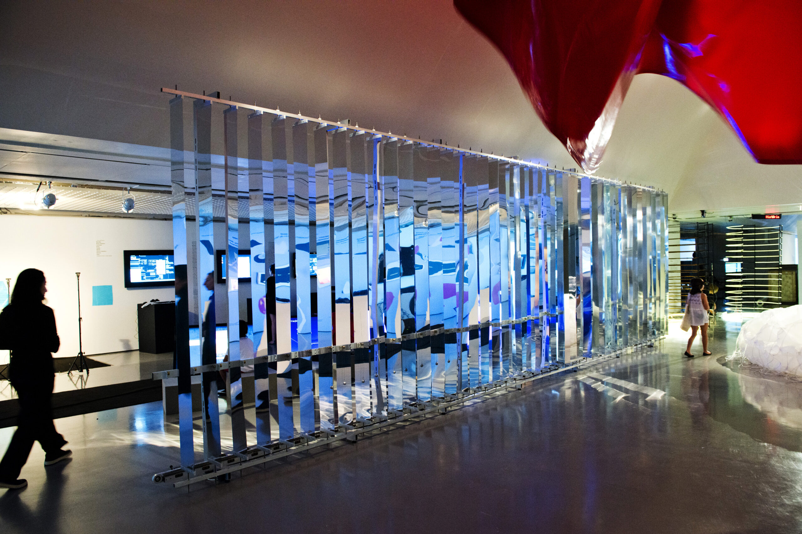 “PAREDE” é uma escultura cinética, interativa, composta de 45 placas de alumínio espelhado que, em cadeia, rotacionam 180°. O efeito em cadeia ocorre em função das ações dos visitantes. Como na brincadeira com dominós, a passagem de um interator por uma das extremidades da instalação aciona um mecanismo de movimento; as placas giram, uma a uma até que todas sejam rotacionadas.