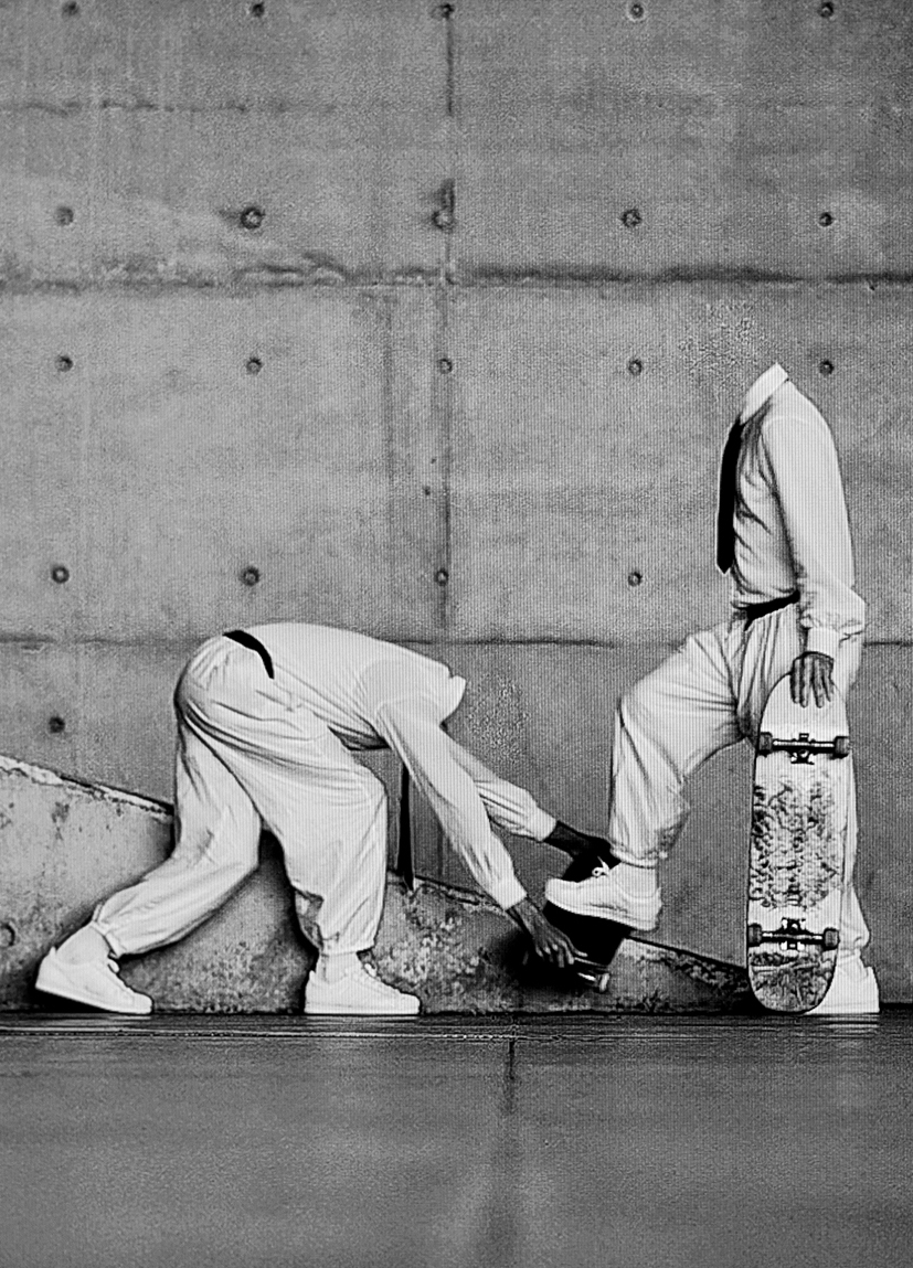 Como seriam dois skatistas em um mundo bizarro? Uma conclusão possível é que seus movimentos seriam outros, que usariam um estranho e elegante traje branco e que não teriam cabeças.