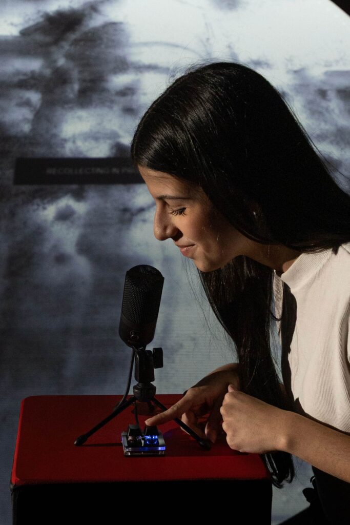 A instalação interativa convida os participantes a sussurrar 7 segundos de memórias que estão desaparecendo e monta memórias visuais coletivas sintéticas baseadas nos estímulos e inputs da fala em tempo real, borrando os limites entre lembrança e imaginação através do sistema de design em IA e visualização experimental interativa.