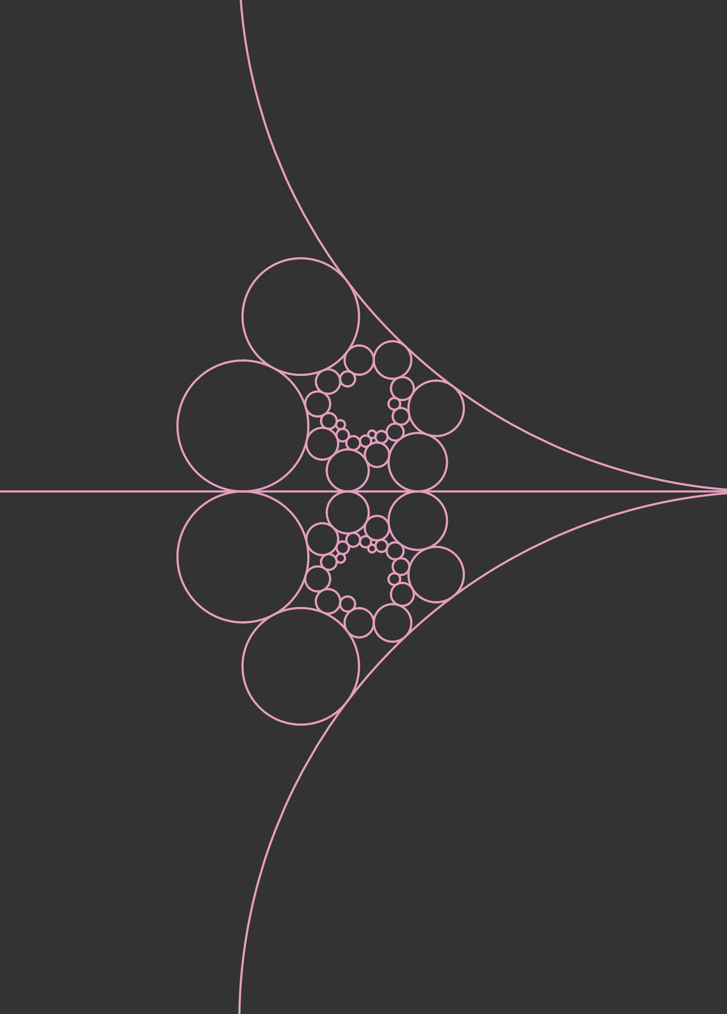 O plano hiperbólico foi o primeiro exemplo de um espaço a exibir uma geometria não-euclidiana, mas é impossível visualizálo sem distorcer de alguma forma a perspectiva. Esta obra mostra duas cópias do plano hiperbólico, cada uma contendo 24 círculos rotativos congruentes. O fato de os círculos serem congruentes na métrica hiperbólica revela a distorção que esse modelo provoca nos tamanhos percebidos.