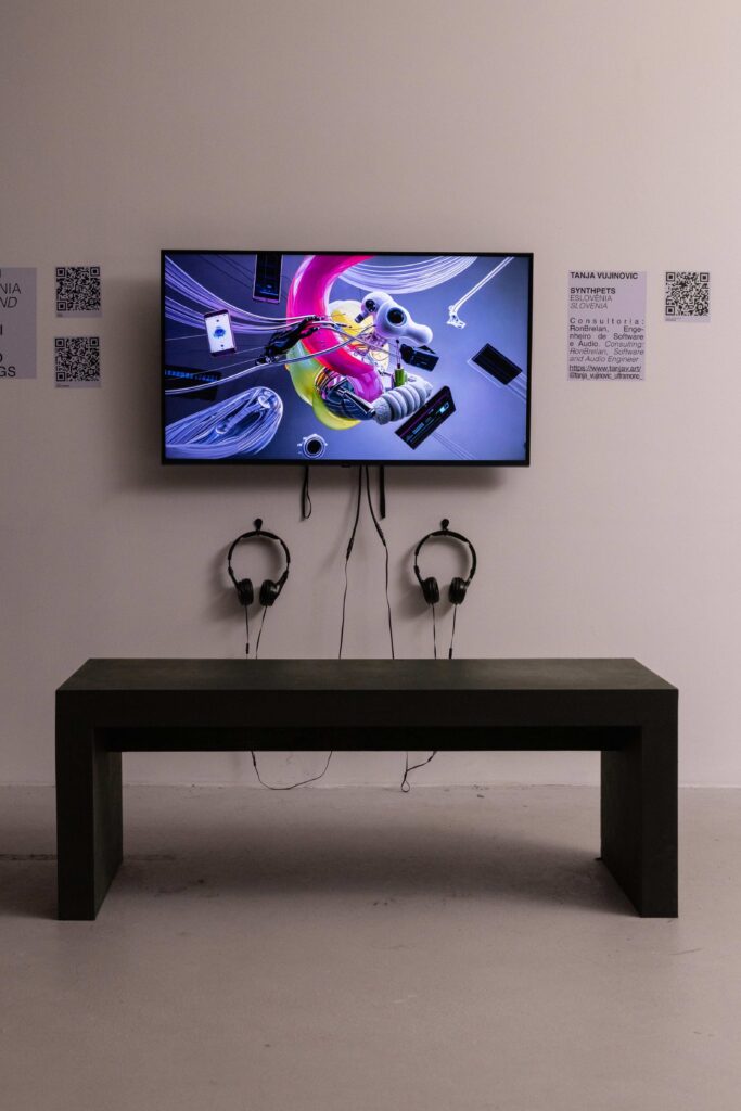 Gráficos 3D, escultura e pintura digital, formas geradas por IA e som de Tanja Vujinovic. A produção é de Tanja Vujinovic/Ultramono, com desenvolvimento contínuo em 2024.