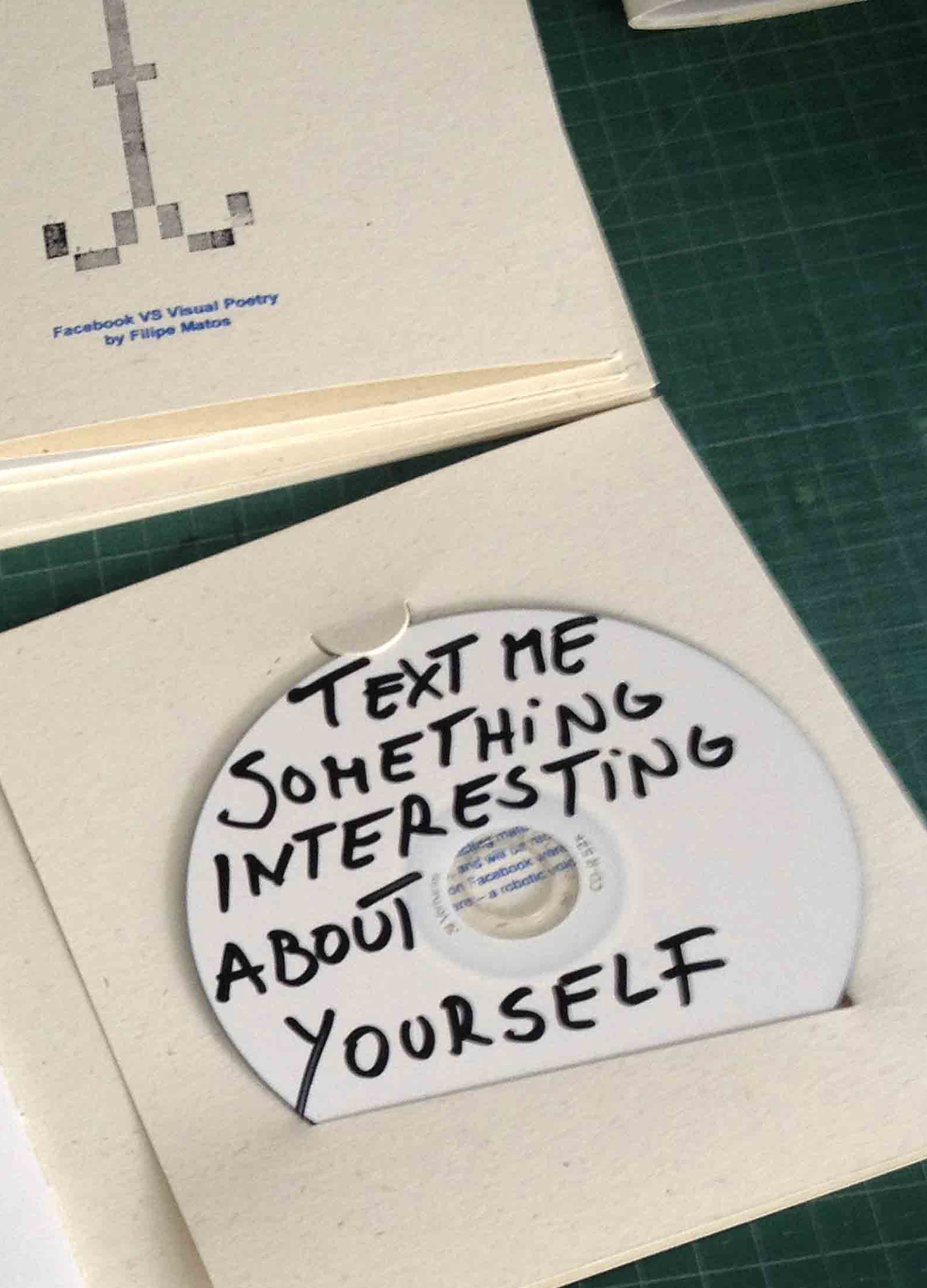 “Text me Something Interesting about Yourself” (Escreva-me Algo Interessante sobre Você) foi criada com o propósito de coletar material para uma obra de áudio que utiliza um software de conversão de texto para áudio, e que será gravado em CD para fazer parte do livro. Os textos coletados em posts do Facebook foram editados e manipulados através do software de texto-para-áudio – uma voz robótica, sem entonação.
