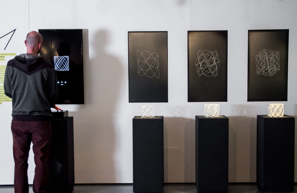 ”The Harmonic Series” é uma junção de dispositivos mecânicos, software, esculturas e imagens impressas que explora a harmonia musical. Cordas emitindo vibrações em diferentes intensidades são representadas através de figuras de Lissajous, convidando os visitantes a descobrirem uma relação entre harmonia musical e visual.