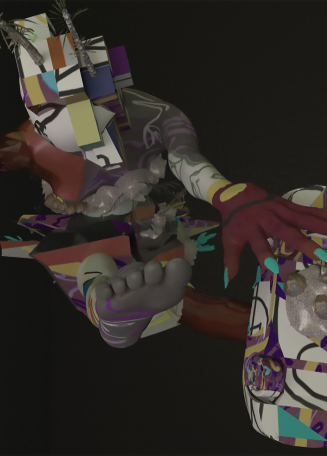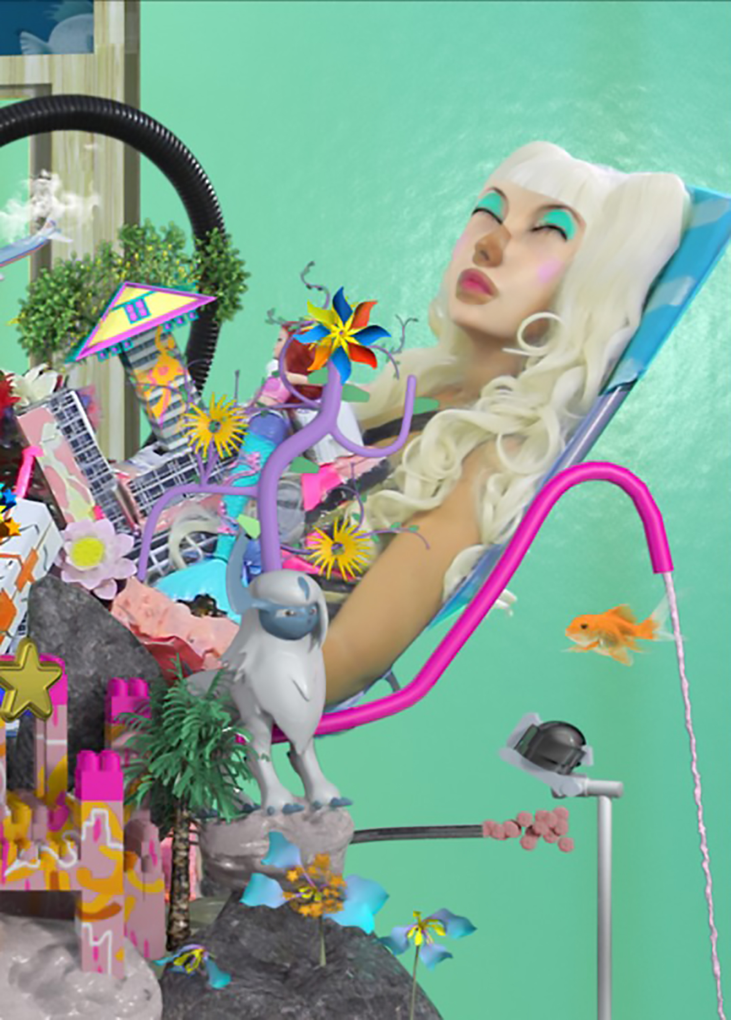 Katie Torn (n. 1982, Nova York, Nova York) integra computação gráfica 3D e vídeo para criar impressões vibrantes e trabalhos experimentais de imagens em movimento. Usando os detritos da Internet e da cultura de consumo, as montagens digitais de Torn carregam traços de eras de commodities passadas e histórias de navegação na web."Meu trabalho oferece uma visão de um novo tipo de substância 'natural' que se origina no virtual e mescla materiais orgânicos e sintéticos", explica Torn. Em seus mundos fantásticos, corpo e objeto são muitas vezes intercambiáveis, refletindo como a formação da identidade é muitas vezes ligados às mercadorias plásticas que nos cercam desde a infância.